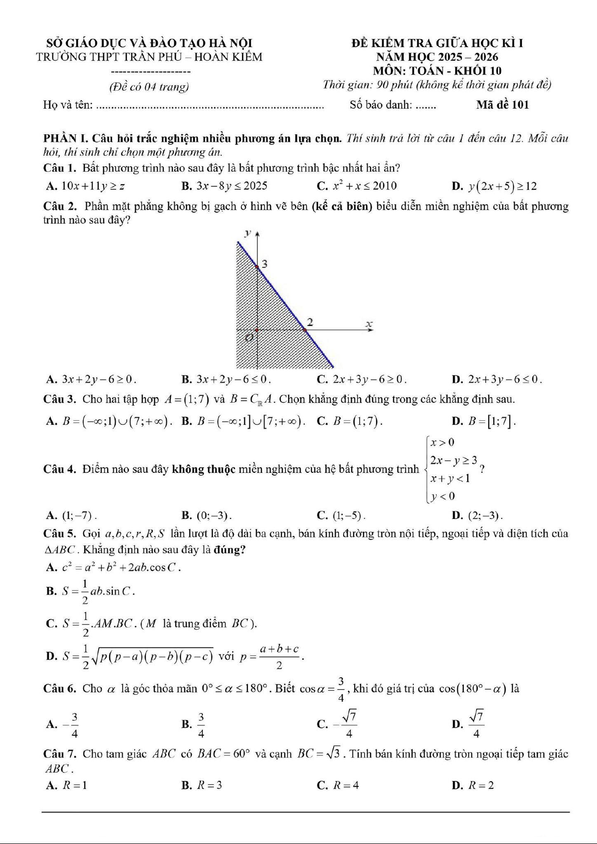 Đề giữa học kì 1 Toán 10 năm 2025 – 2026 trường THPT Trần Phú – Hà Nội
