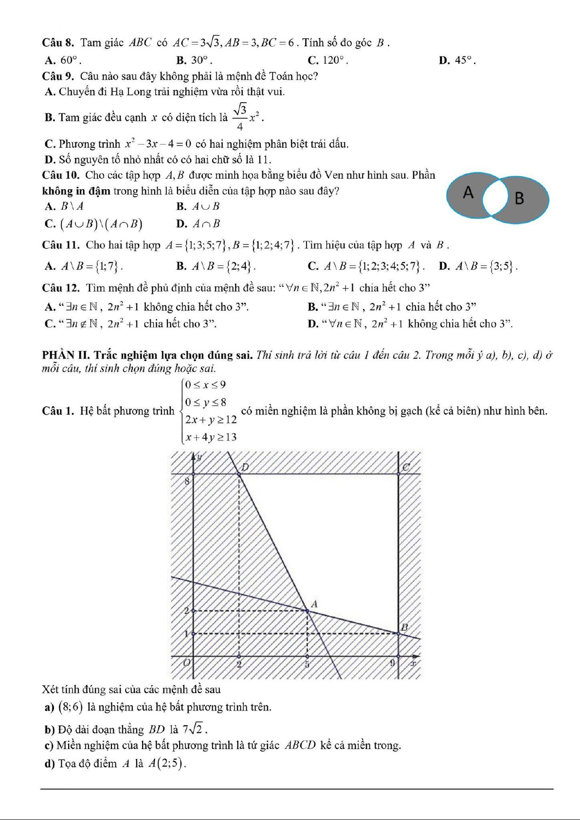 Xin giới thiệu đến quý thầy, cô giáo và các em học sinh đề kiểm tra giữa học kì 1 môn Toán 10 năm học 2025 – 2026 trường THPT Trần Phú – Hoàn Kiếm, thành phố Hà Nội. Đề thi gồm 12 câu trắc nghiệm nhiều phương án lựa chọn + 02 câu trắc nghiệm đúng sai + 04 câu trắc nghiệm trả lời ngắn + 04 câu tự luận, thời gian làm bài 90 phút.