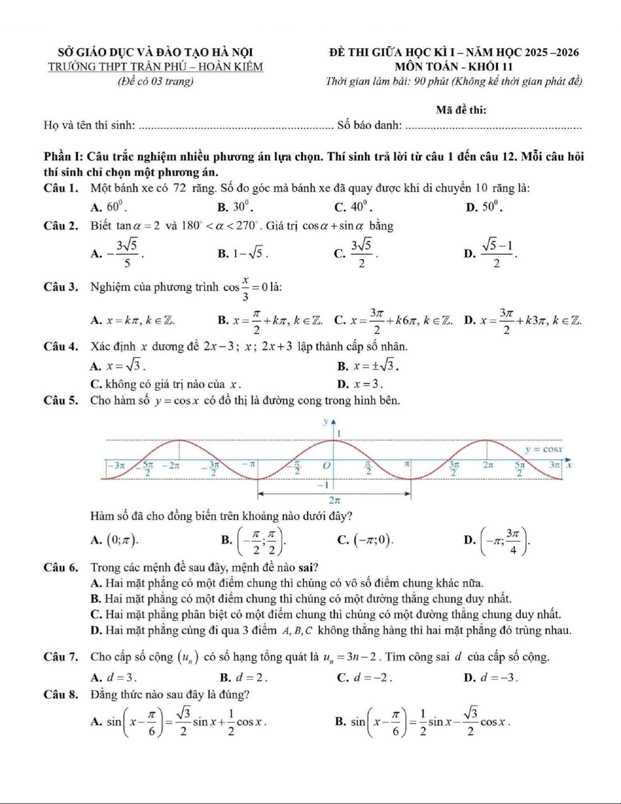 Đề giữa học kì 1 Toán 11 năm 2025 – 2026 trường THPT Trần Phú – Hà Nội