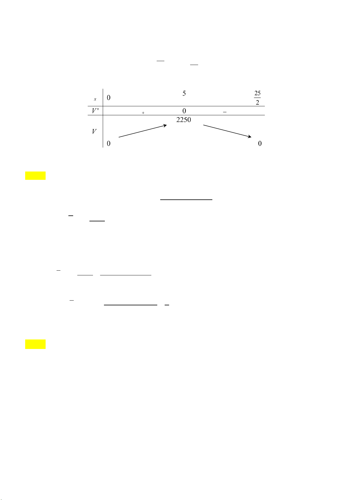 40 2 25 2 x = 4x −130x +1000x 50 x = 25 2 V ' 12x 260x 1000 0 = − + = ⇔ 3 , x ∈0; 2 x = 5 Bảng biến thiên