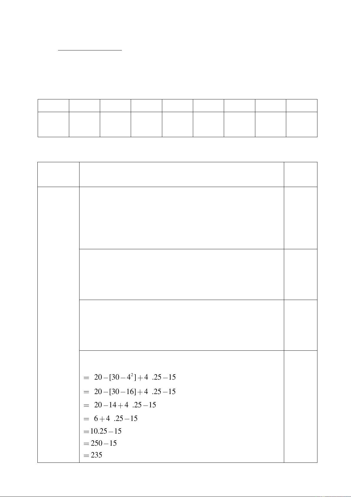 b) 48. 27 – 15. 27 + 67. 27. = 27.(48 – 15 +67) 0,25 = 27.100 = 2700 0,25 c) 20180 + 79: 77 + 12: 2 = 1 + 72 + 6 0,25 = 1 + 49 + 6 0,25 = 56 d) 2 20 30 5 1 4.2515 2 20 [30 4 ] 4 .25 15 0,25 20 [30 16] 4 .25 15 20 14 4 .25 15 0,25 6 4 .25 15 10.25 15 250 15 235 Câu 2 a) x - 123 = 17 (2 điểm) x = 17 + 123 0,25 x = 140 0,25 b) 35 + 5.(x + 4) = 24.5 5.(x + 4) = 80 - 35 0,25 5.(x + 4) = 45 (x + 4) = 45:5 (x + 4) = 9 x = 9 – 4 x = 5 0,25