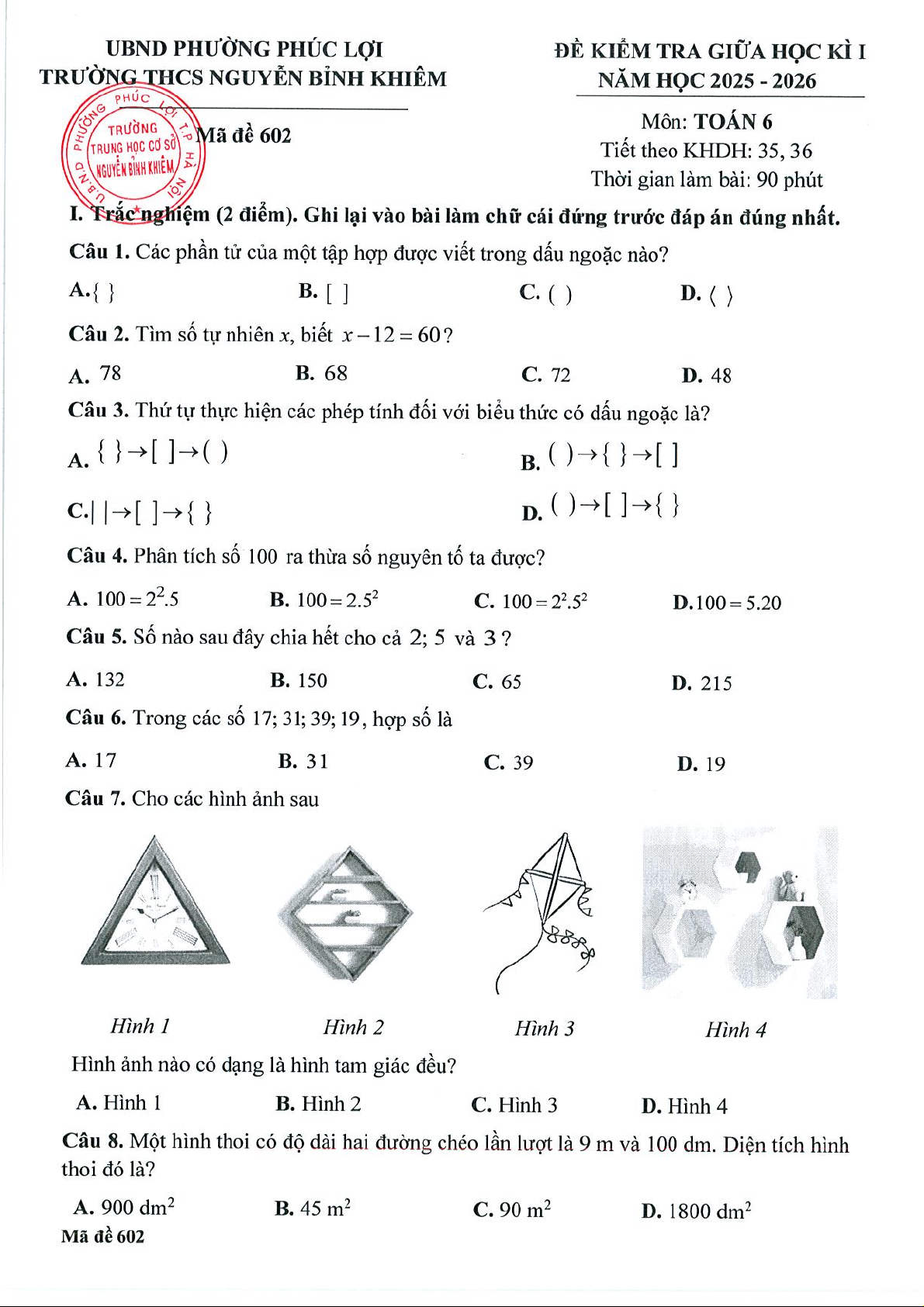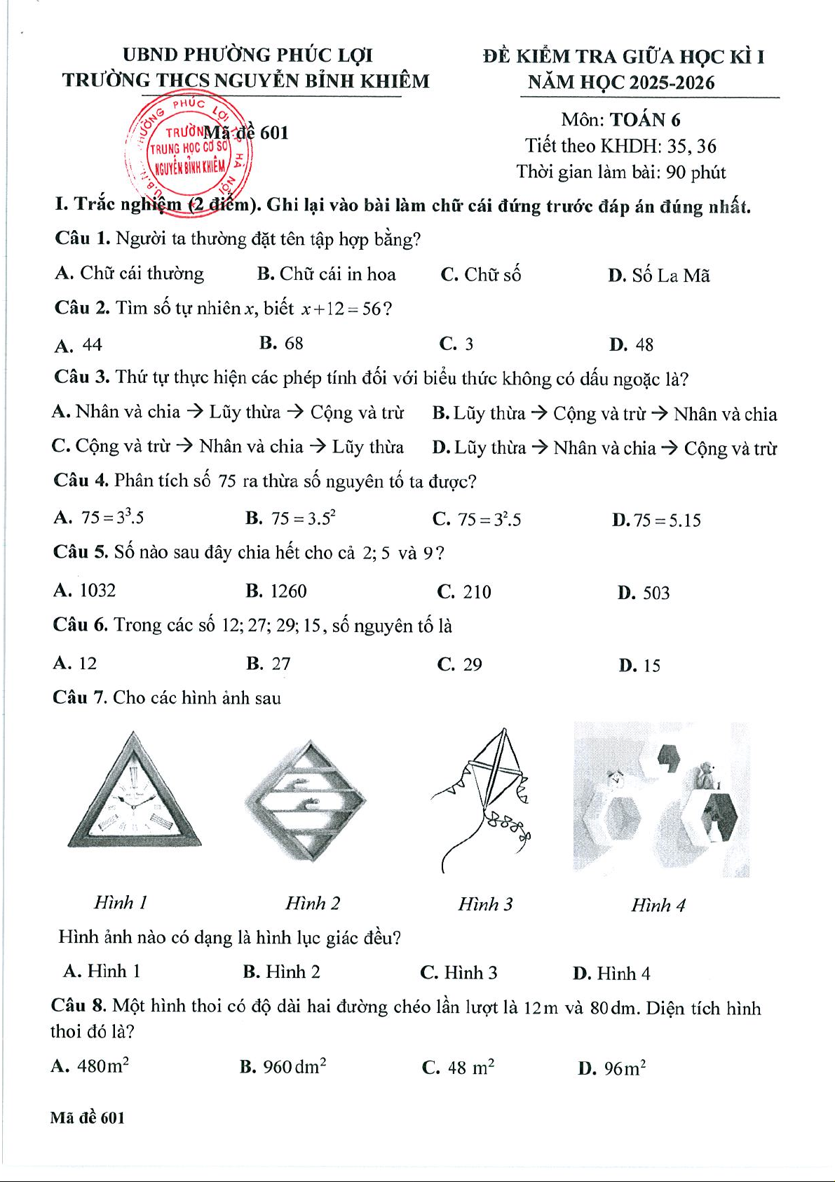 Xin giới thiệu đến quý thầy, cô giáo và các em học sinh đề kiểm tra giữa học kì 1 môn Toán 6 năm học 2025 – 2026 trường THCS Nguyễn Bỉnh Khiêm, phường Phúc Lợi, thành phố Hà Nội.