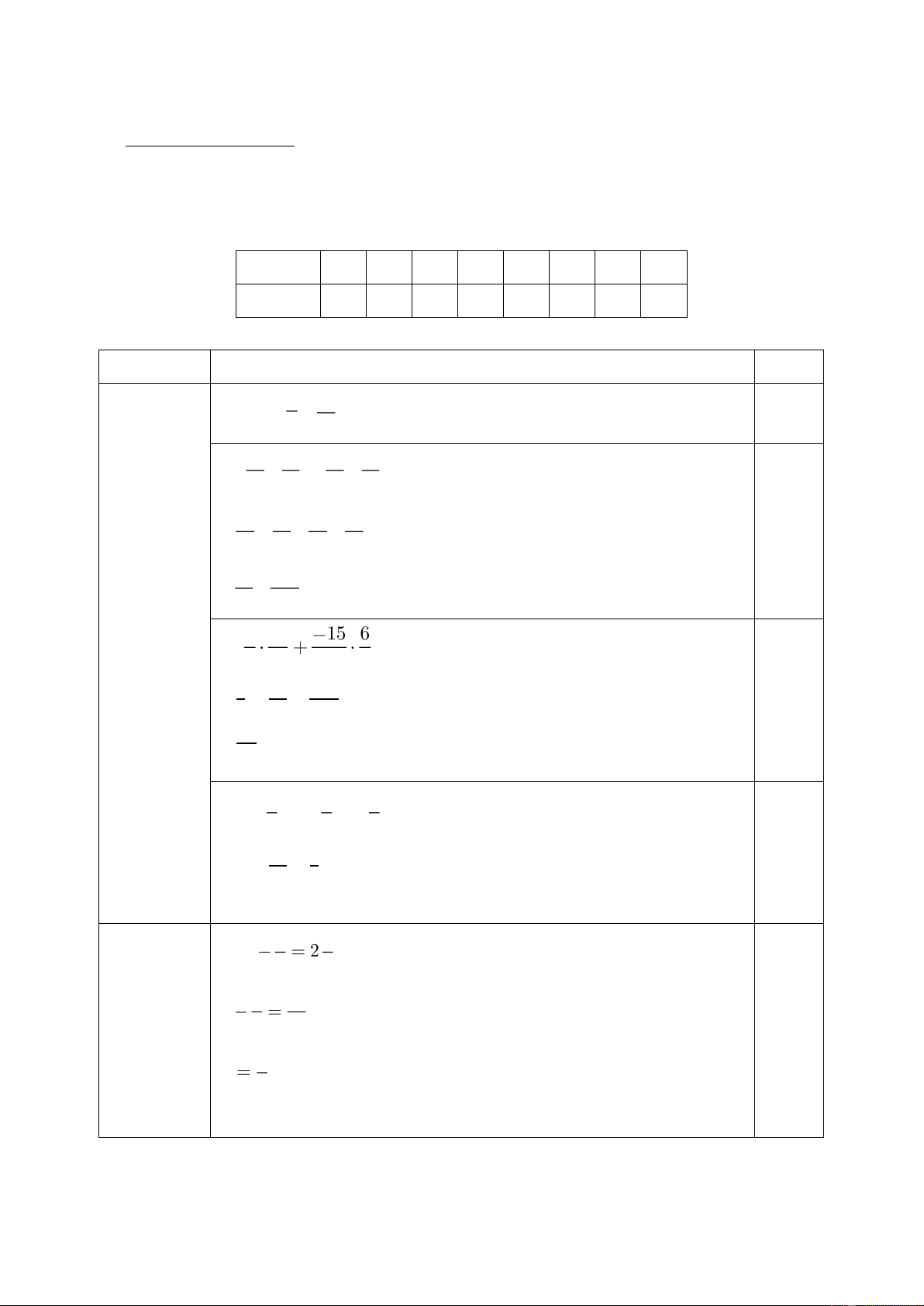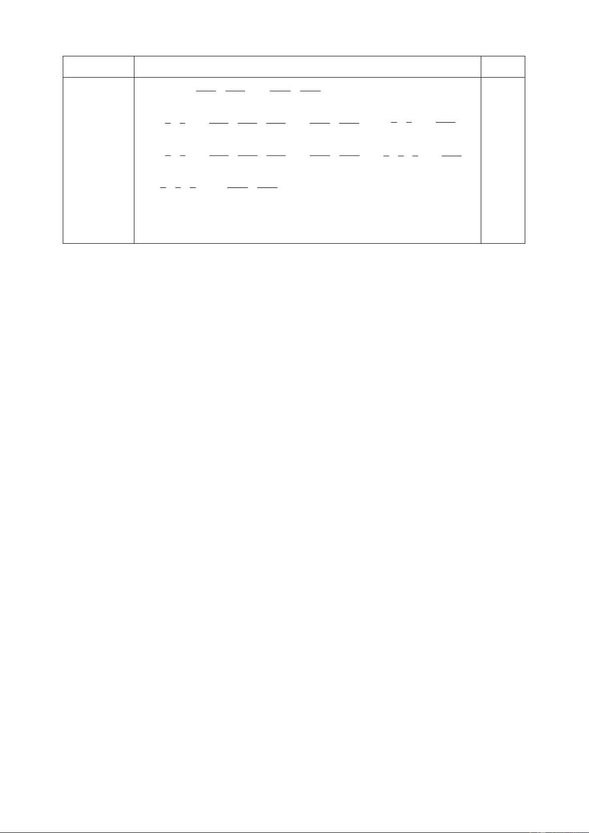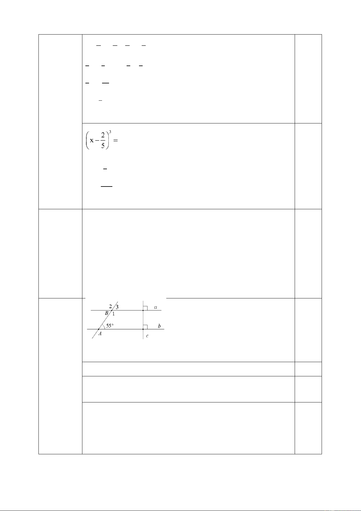 II. Tự luận (8 điểm) Bài Đáp án Điểm 2 a) 0,6 19 . 0,5 3 15 b) 15 5 3 18 12 13 12 13 15 5 3 18 0,25 12 13 12 13 12 1 3 0. 0,25 12 13 1 6 2 15 6 c) (2 điểm) 7 13 13 7 6 2 −15 = . ( + ) 0,25 7 13 13 −6 = 7 0,25 0 2 d) 1 4 2 2 7 9 3 22 4 = 1 – + 0,25 9 9 0,25 = – 1 1 1 a) x 2 3 6 1 13 2 x 3 6 (1.5 điểm) 0,25 5 x 2 0,25 KL 2 2 1 1 b) x x 3 5 2 3 2 1 1 2 x – x = – + 0,25 3 2 3 5 1 1 x = 6 15 2 x = 5 0,25 KL c) - 64 0,25 2 x − = −4 5 −18 0,25 x = 5 KL 3