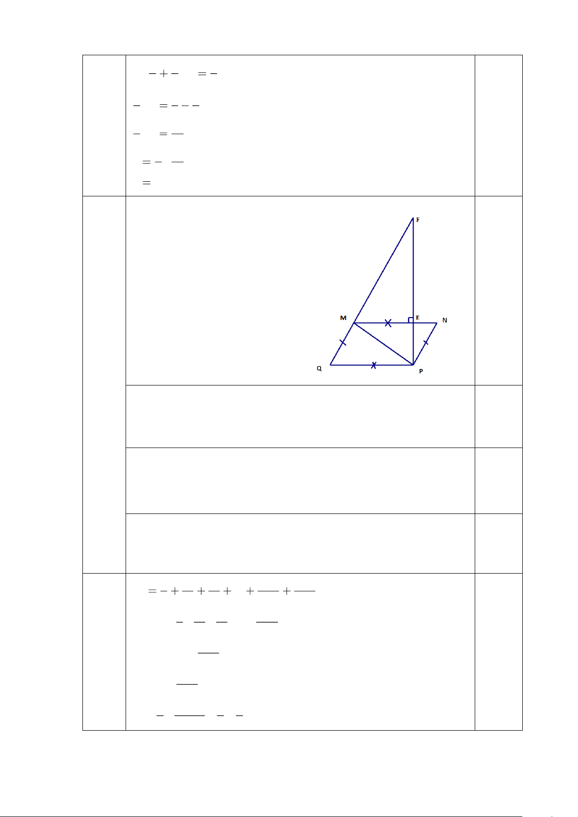 Đáp C C A D B D C B D C B A B A A D án II. Tự luận: 6,0 điểm Câu Đáp án Điểm 17 a) 95 5 1 22 (1,5đ) 32 17 32 13 95 1 5 22 0,25 32 32 17 17 0,25 3 1 4 5 3 − − b) 3 1 1 0 + : .6 − 2025 2 2 2 2 3 1 − = + .6 −1 0,25 2 2 3 1 = + .6 −1 2 4 3 3 = + −1 = 2 0,25 2 2 c) 5 3 13 3 2 . . 18 17 18 17 17 3 5 13 2 . 17 18 18 17 0,25 3 2 . 1 17 17 3 2 17 17 5 0,25 17 18 a) 11 1 13 x + = 0,25 (1,0đ) 2 6 12 11 13 1 x = − 2 12 6 11 11 x = 0,25 2 12 1 x = 6 b) 1 3 2 : x 4 4 5 3 2 1 : x 4 5 4 0,25 3 3 : x 4 20 3 3 x : 4 20 0,25 x 5 19 - Vẽ hình, ghi GT, KL (2,5đ) 0,25 a) Xét M