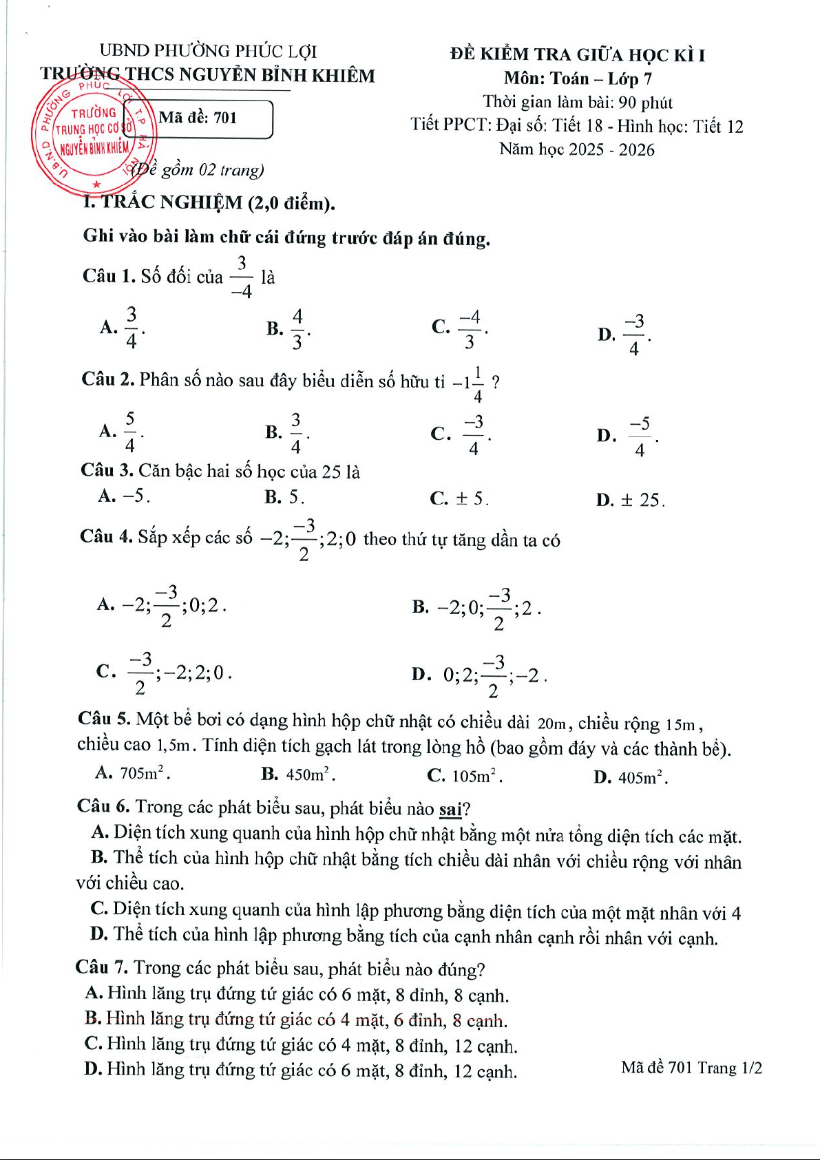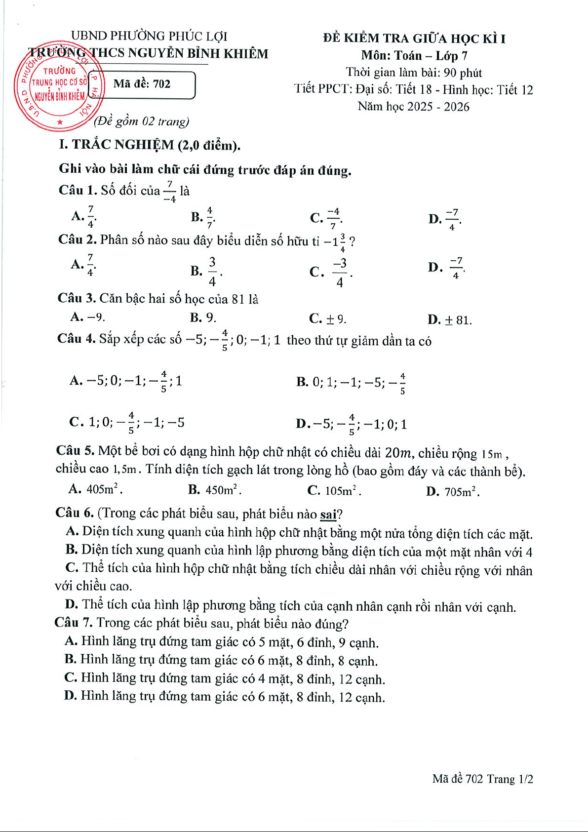 Xin giới thiệu đến quý thầy, cô giáo và các em học sinh đề kiểm tra giữa học kì 1 môn Toán 7 năm học 2025 – 2026 trường THCS Nguyễn Bỉnh Khiêm, phường Phúc Lợi, thành phố Hà Nội.