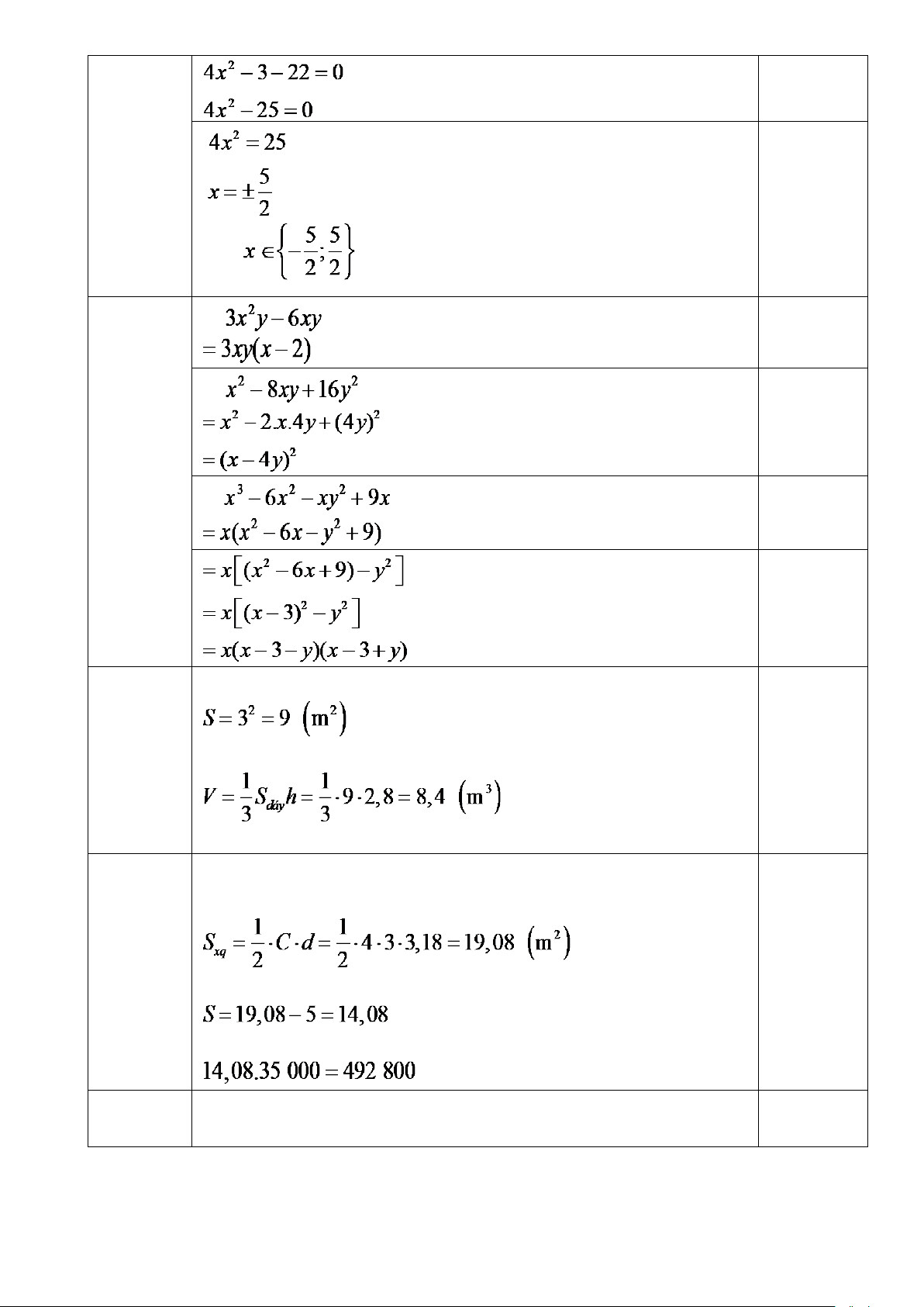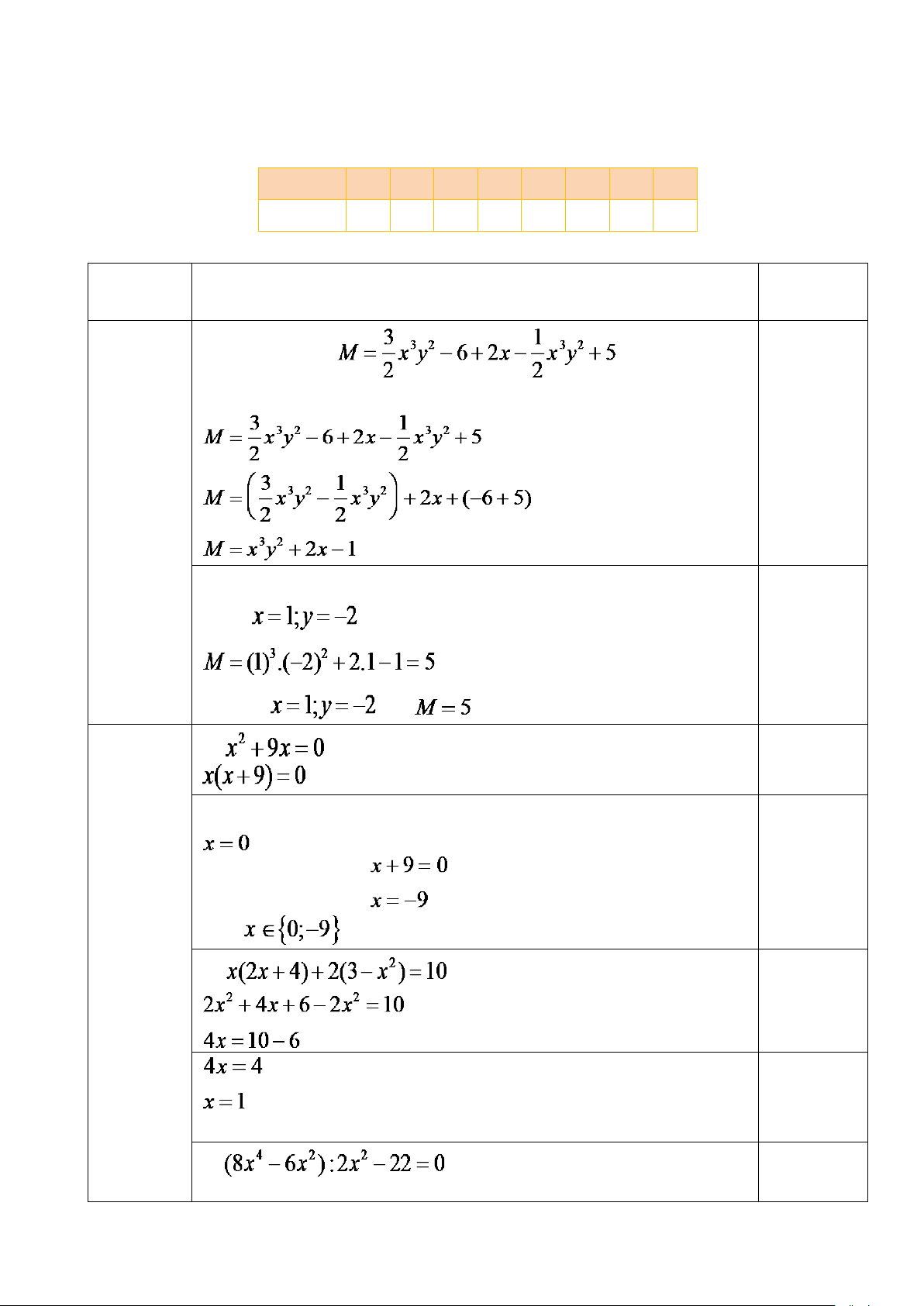 b) Tính giá trị của biểu thức M tại x =1; y = 2 − . Thay vào biểu thức M ta có: 0,25đ Vậy tại thì 0,25đ Bài 2. a) 0,25đ (1,5đ) a) 0,5đ b) 0,5đ TH1: TH2: 0,25đ c) 0,5đ Vậy b) 0,25đ Vậy x = 1 0,25đ c) 0,25đ 0,25đ Vậy Bài 3. a) 0,5đ (1,5đ) a) 0,5đ b) 0,5đ b) 0,5đ c) 0,5đ c) 0,25đ 0,25đ