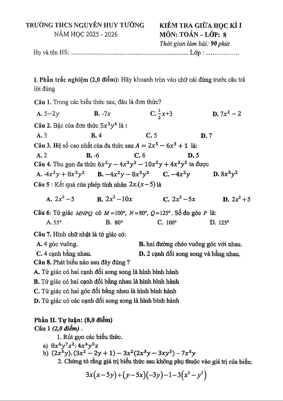 Xin giới thiệu đến quý thầy, cô giáo và các em học sinh đề kiểm tra giữa học kì 1 môn Toán 8 năm học 2025 – 2026 trường THCS Nguyễn Huy Tưởng, thành phố Hà Nội.