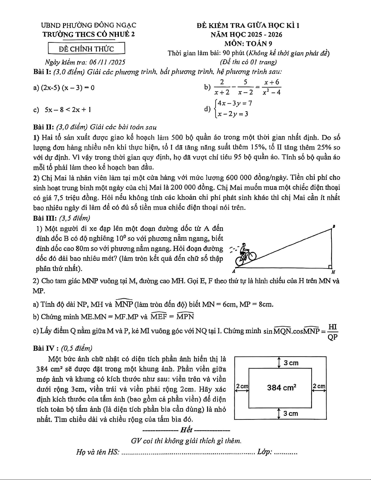 Xin giới thiệu đến quý thầy, cô giáo và các em học sinh đề kiểm tra giữa học kì 1 môn Toán 9 năm học 2025 – 2026 trường THCS Cổ Nhuế 2, phường Đông Ngạc, thành phố Hà Nội.