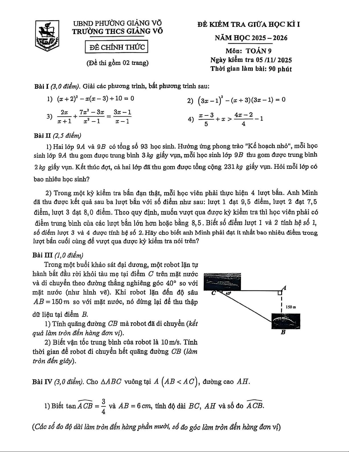 Xin giới thiệu đến quý thầy, cô giáo và các em học sinh đề kiểm tra giữa học kì 1 môn Toán 9 năm học 2025 – 2026 trường THCS Giảng Võ, phường Giảng Võ, thành phố Hà Nội. Kỳ thi được diễn ra vào ngày 05 tháng 11 năm 2025.