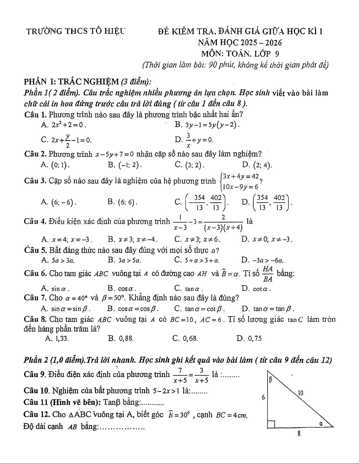 Đề giữa học kì 1 Toán 9 năm 2025 – 2026 trường THCS Tô Hiệu – Phú Thọ