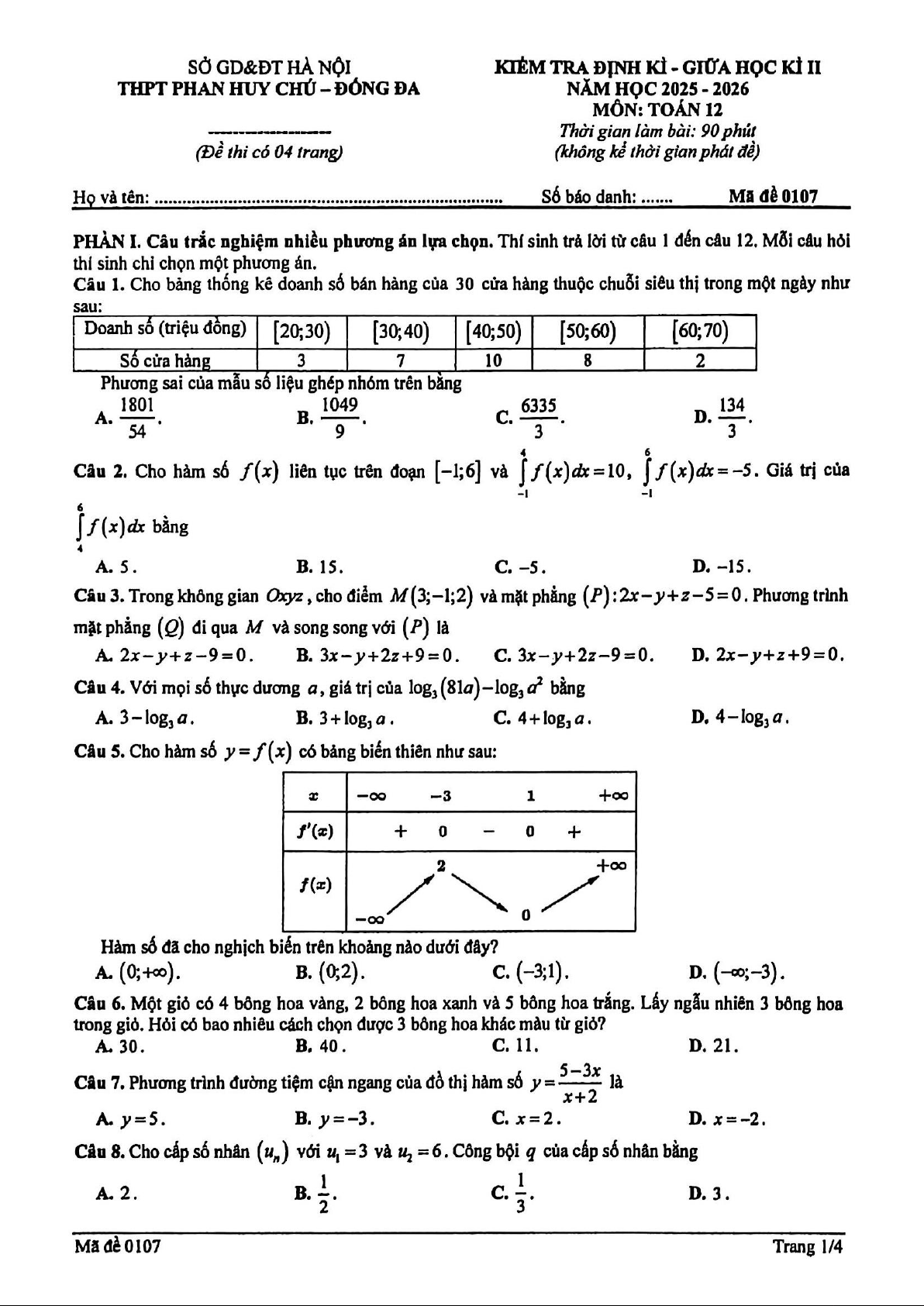 Xin giới thiệu đến quý thầy, cô giáo và các em học sinh đề kiểm tra định kì giữa học kì 2 môn Toán 12 năm học 2025 – 2026 trường THPT Phan Huy Chú – Đống Đa, thành phố Hà Nội.