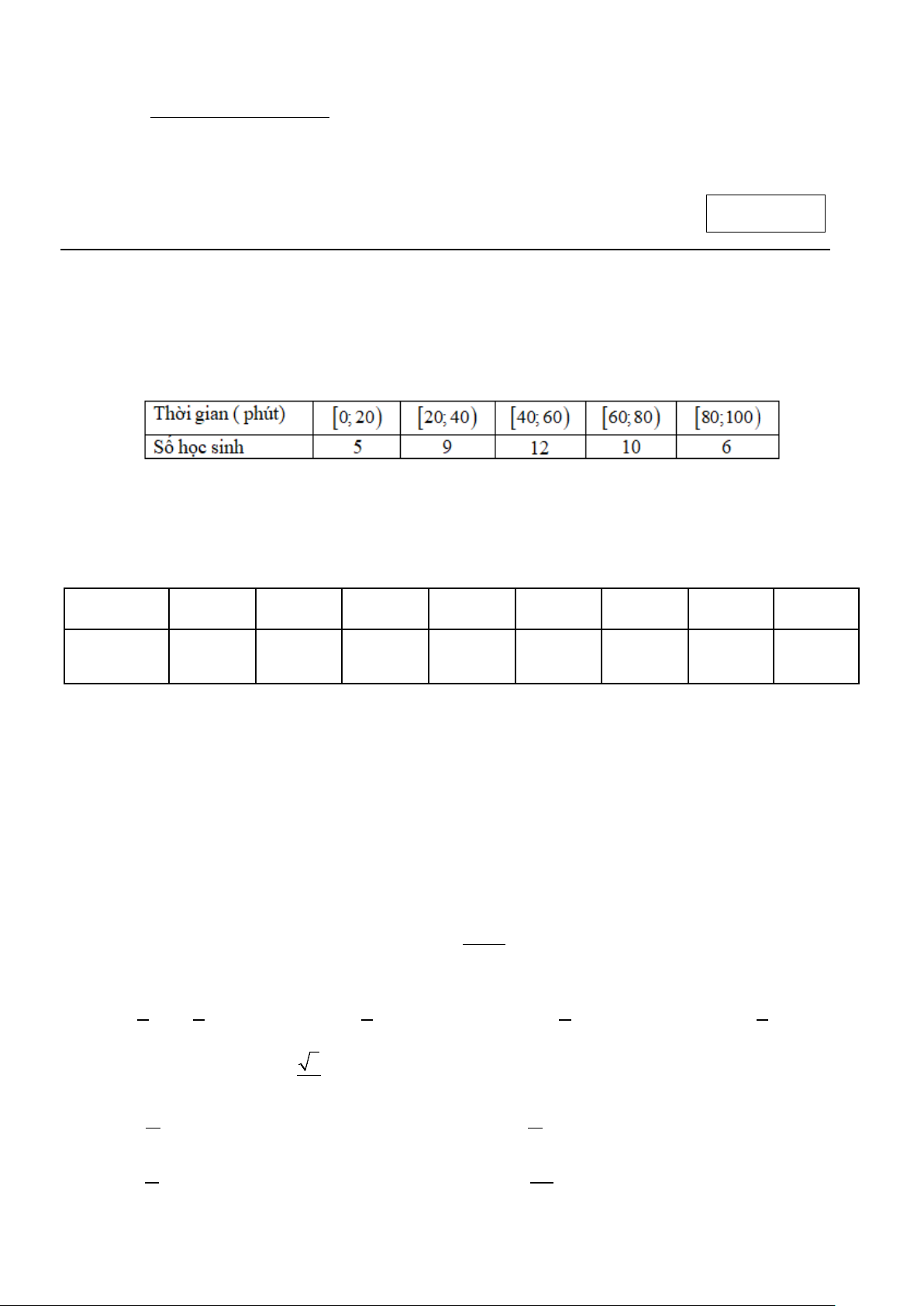 Câu 9. Cho mẫu số liệu ghép nhóm về thống kê thời gian (phút) hoàn thành một bài kiểm tra trực