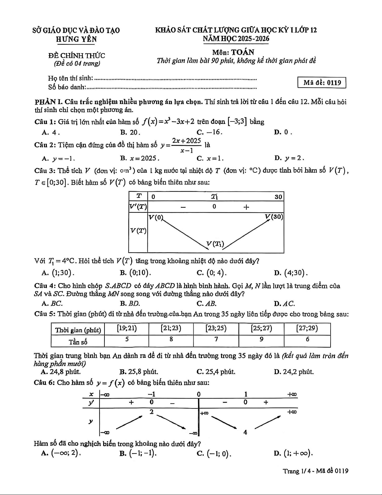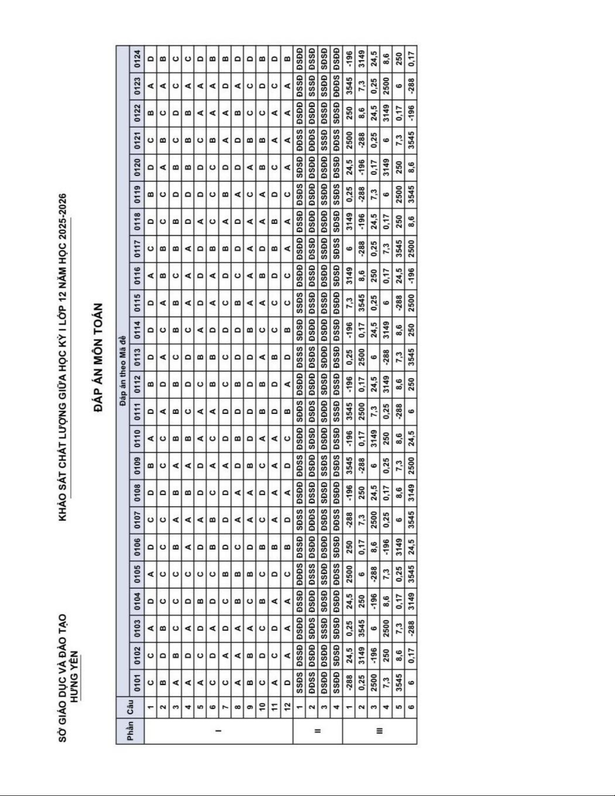 Xin giới thiệu đến quý thầy, cô giáo và các em học sinh đề khảo sát chất lượng giữa học kỳ 1 môn Toán 12 năm học 2025 – 2026 sở Giáo dục và Đào tạo tỉnh Hưng Yên. Đề thi gồm 12 câu trắc nghiệm nhiều phương án lựa chọn + 04 câu trắc nghiệm đúng sai + 06 câu trắc nghiệm trả lời ngắn, thời gian làm bài 90 phút, có đáp án tất cả các mã đề. Kỳ thi được diễn ra vào thứ Bảy ngày 01 tháng 11 năm 2025.