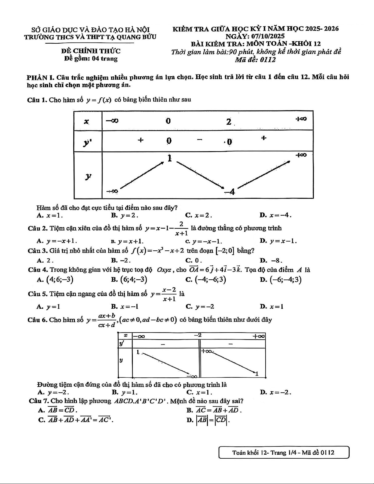 Giới thiệu đến quý thầy, cô giáo và các em học sinh đề kiểm tra giữa học kỳ 1 môn Toán 12 năm học 2025 – 2026 trường THCS và THPT Tạ Quang Bửu, thành phố Hà Nội. Kỳ thi được diễn ra vào ngày 07 tháng 10 năm 2025.