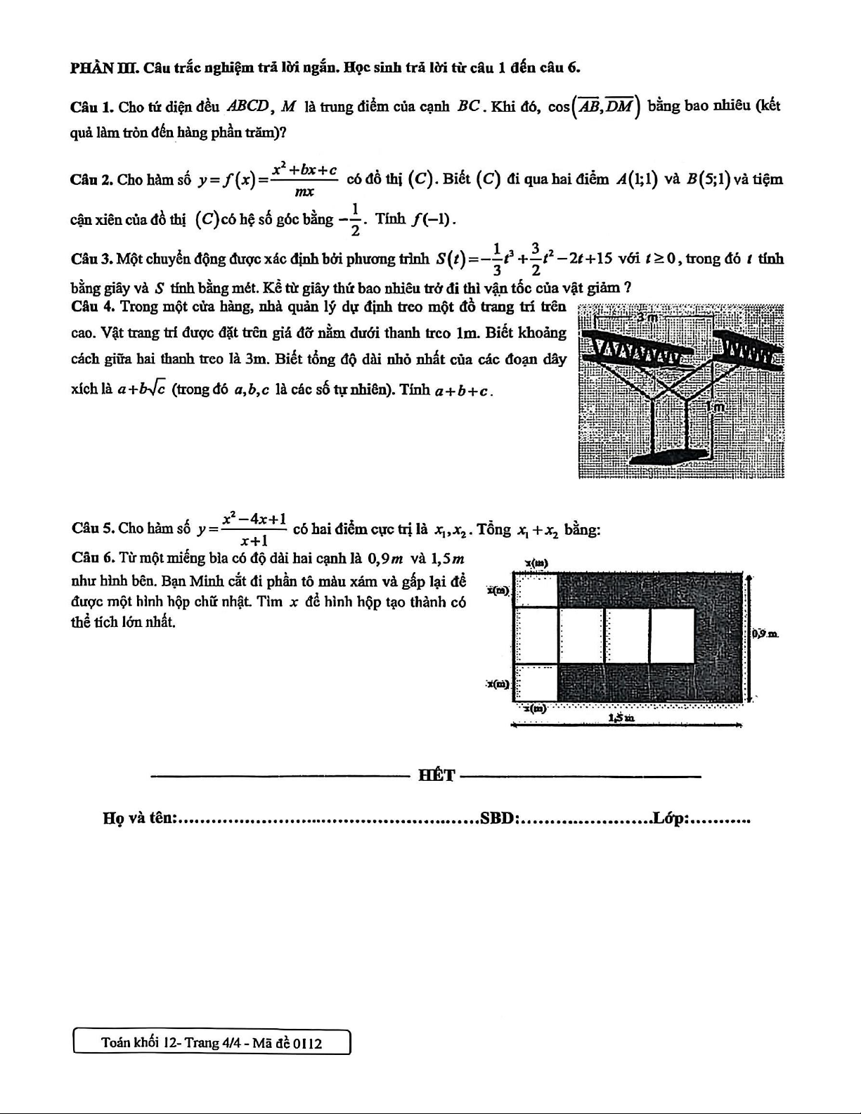 Đề giữa kì 1 Toán 12 năm 2025 – 2026 trường Nguyễn Bỉnh Khiêm – Hà Nội