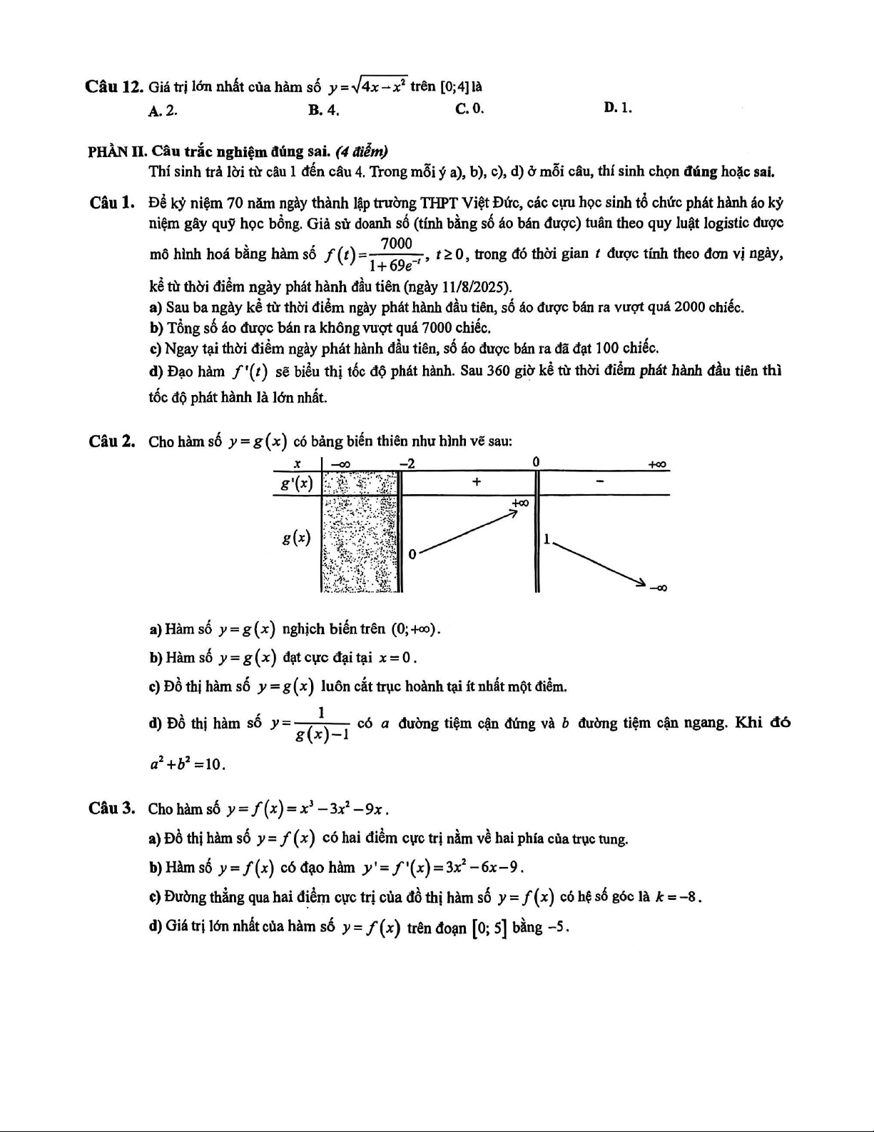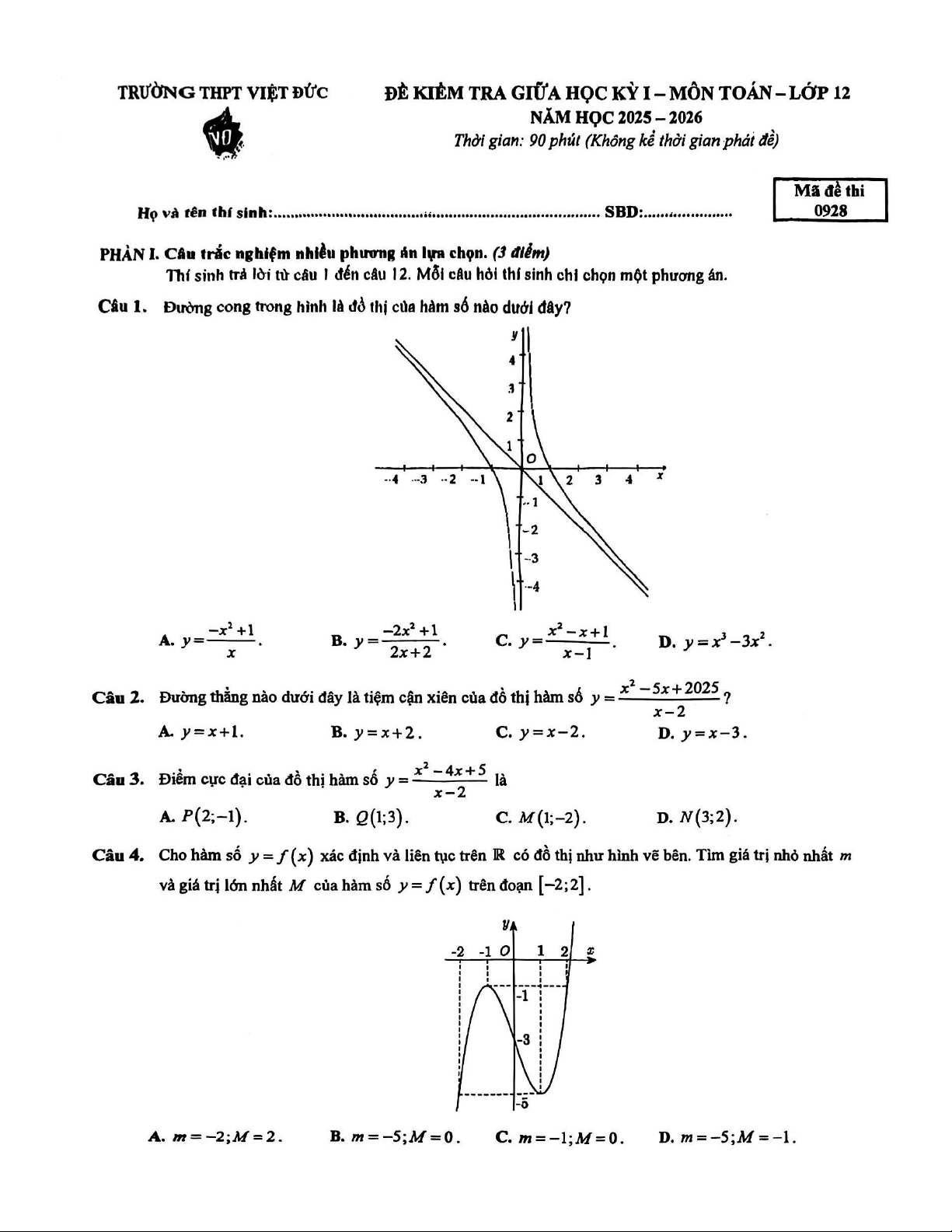 Đề giữa học kỳ 1 Toán 12 năm 2025 – 2026 trường THPT Việt Đức – Hà Nội