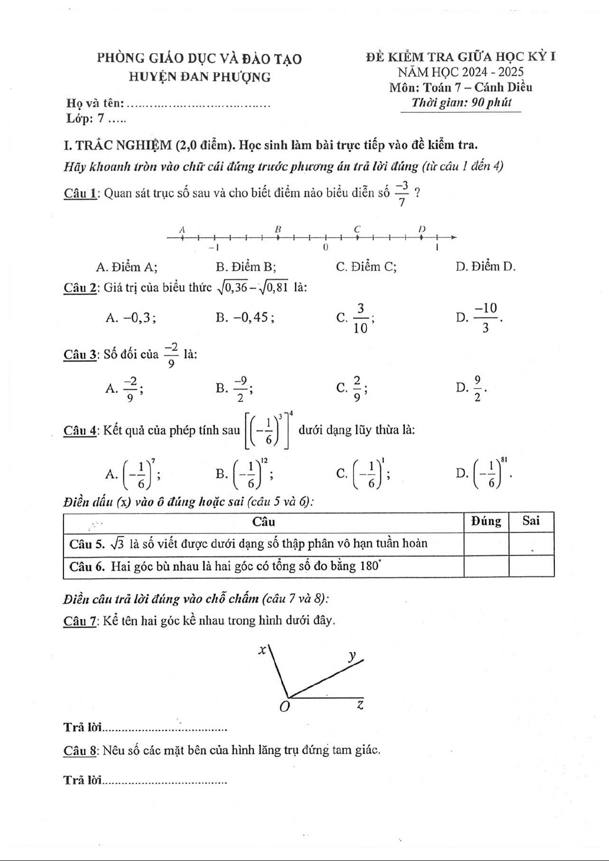 Đề giữa học kỳ 1 Toán 7 năm 2024 – 2025 phòng GD&ĐT Đan Phượng – Hà Nội
