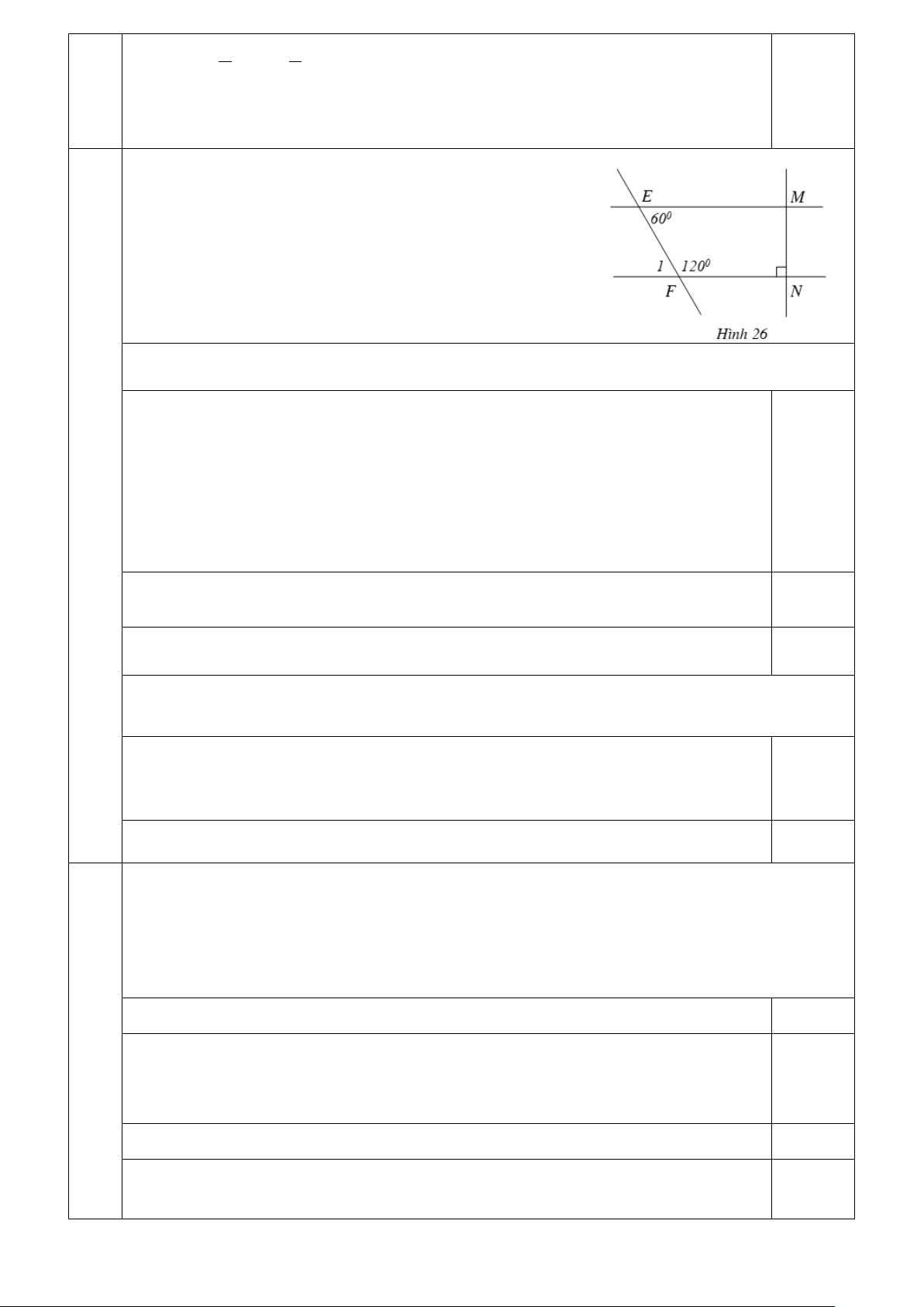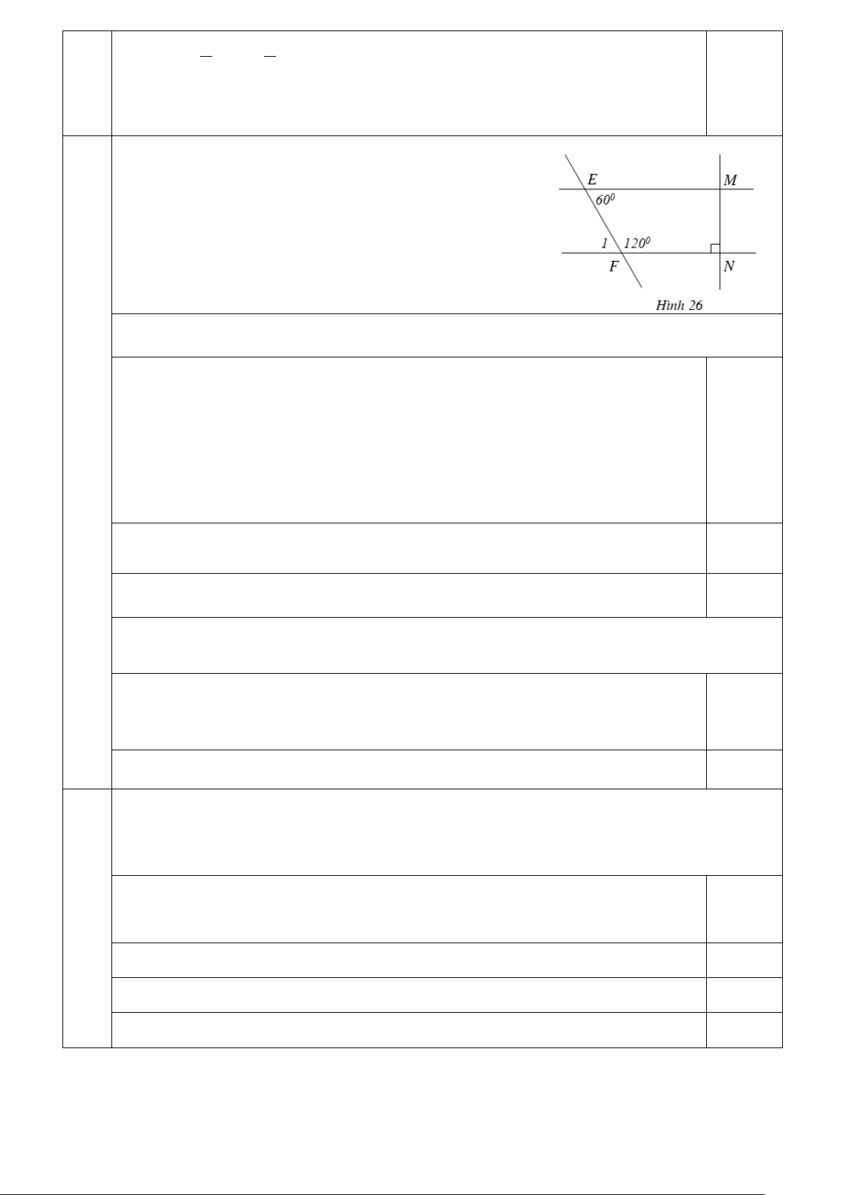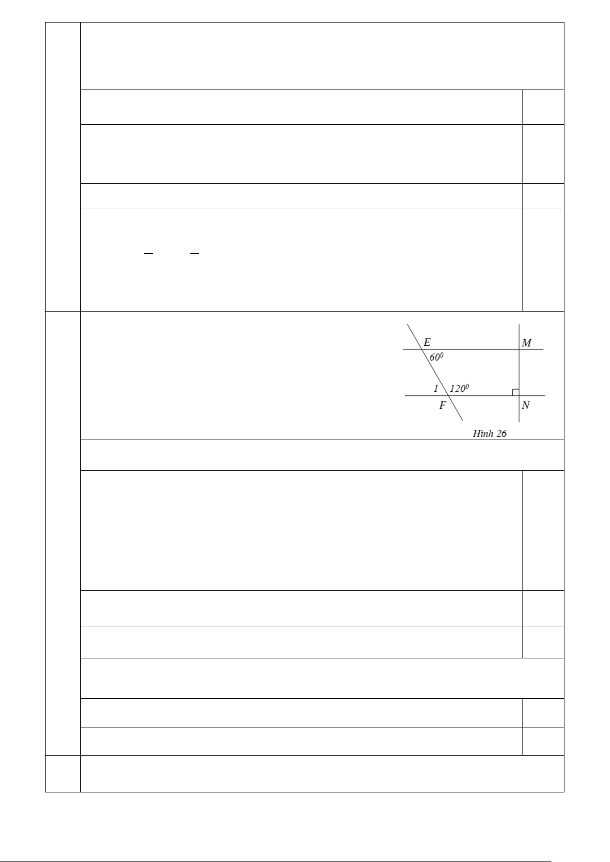 xOt ( Hai góc đối đỉnh) 0.25 Mà 1 xOt = 1 0 0 xOy = .130 = 65 2 2 Vậy 0 mOz = 65 Cho Hình 26 với 0 EFN = 0 FEM = 0 120 ; 60 ; FNM = 90 .