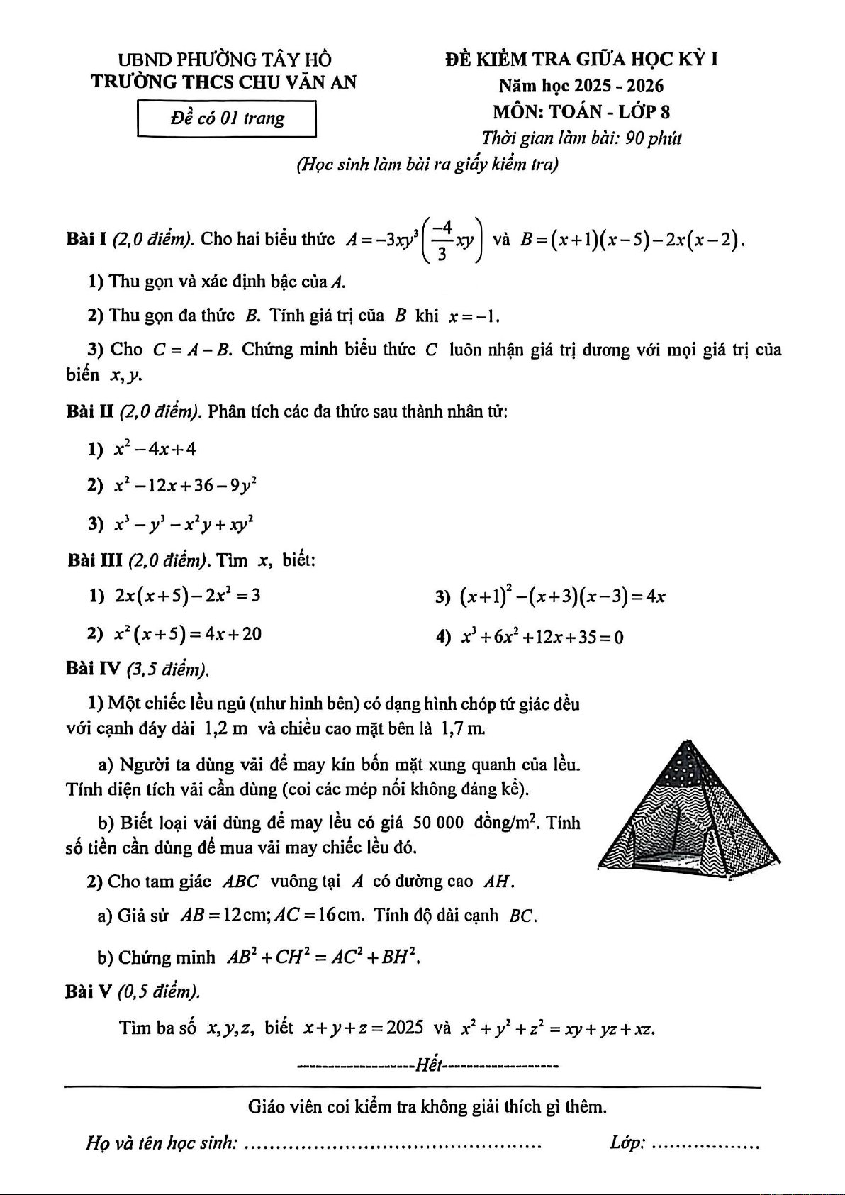Xin giới thiệu đến quý thầy, cô giáo và các em học sinh đề kiểm tra giữa học kỳ 1 môn Toán 8 năm học 2025 – 2026 trường THCS Chu Văn An, phường Tây Hồ, thành phố Hà Nội.