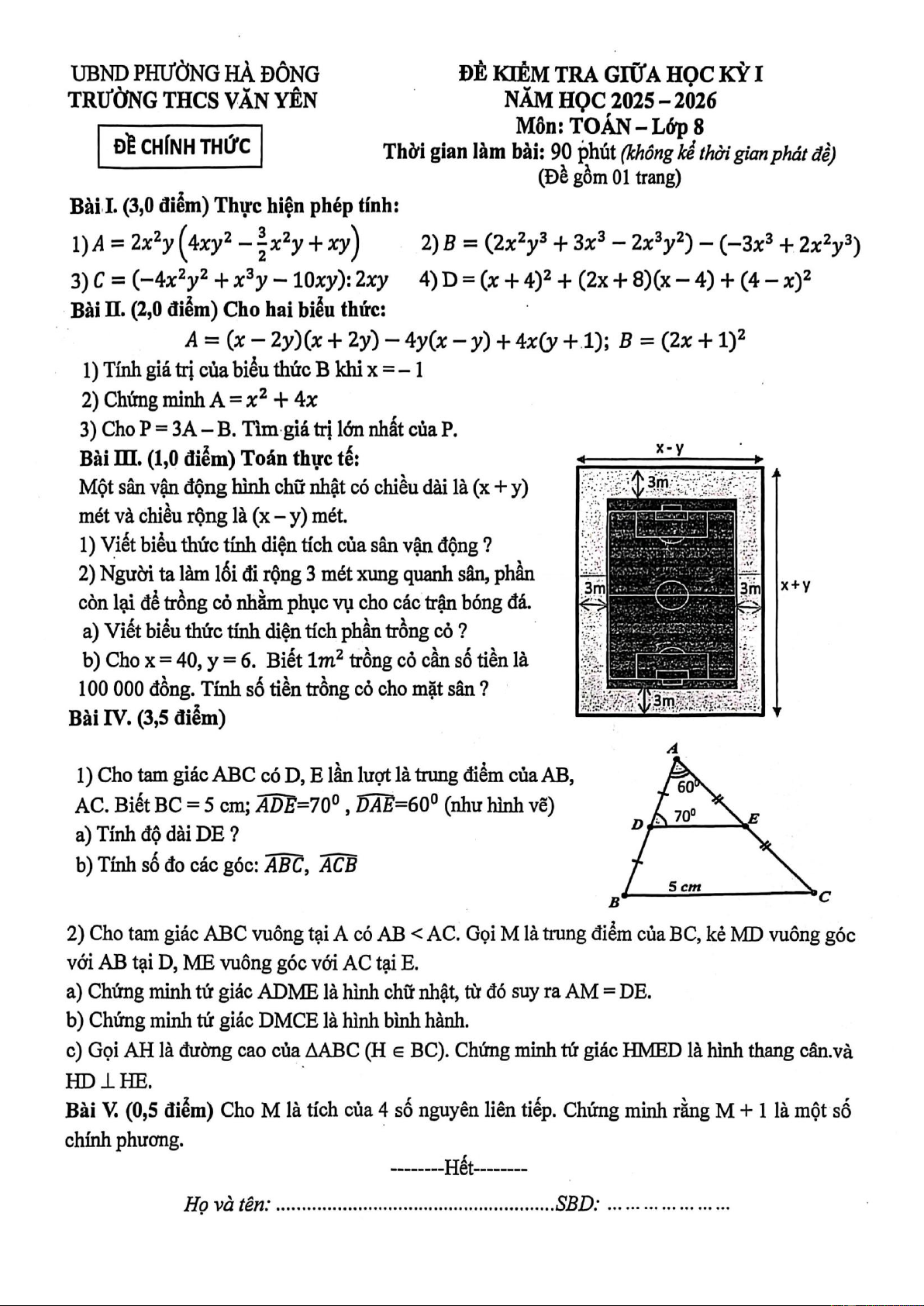 Xin giới thiệu đến quý thầy, cô giáo và các em học sinh đề kiểm tra giữa học kỳ 1 môn Toán 8 năm học 2025 – 2026 trường THCS Văn Yên, phường Hà Đông, thành phố Hà Nội.