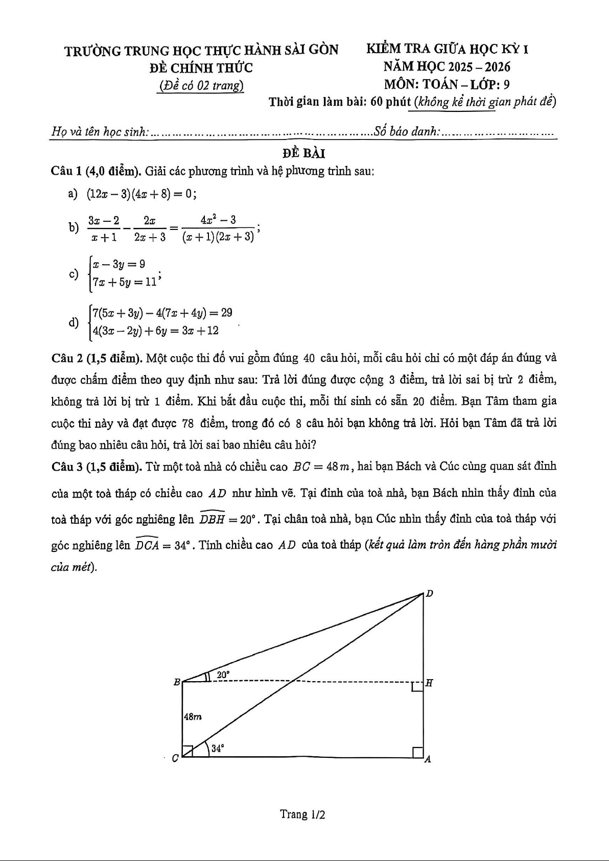 Đề giữa học kỳ 1 Toán 9 năm 2025 – 2026 trường Thực hành Sài Gòn – TP HCM