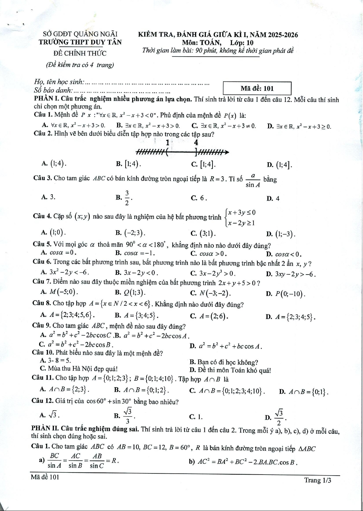 TRƯỜNG THPT DUY TÂN ĐÁP ÁN ĐỀ CHÍNH THỨC Môn:TOÁN Lớp: 10