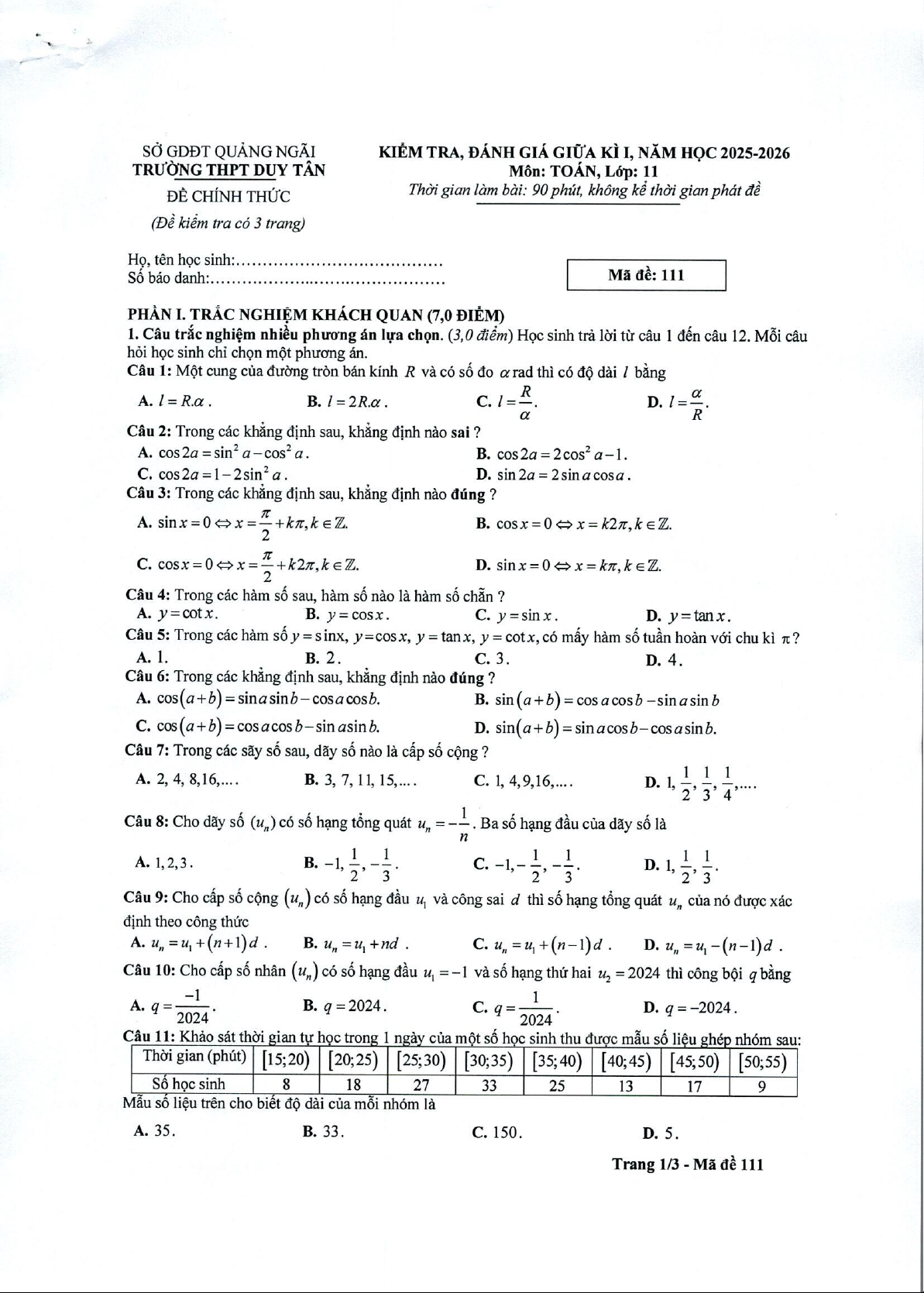 TRƯỜNG THPT DUY TÂN ĐÁP ÁN Môn: TOÁN, Lớp: 11 ĐỀ CHÍNH THỨC