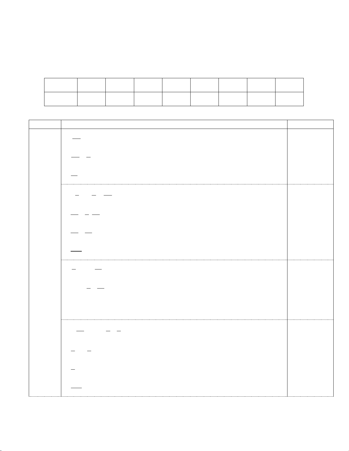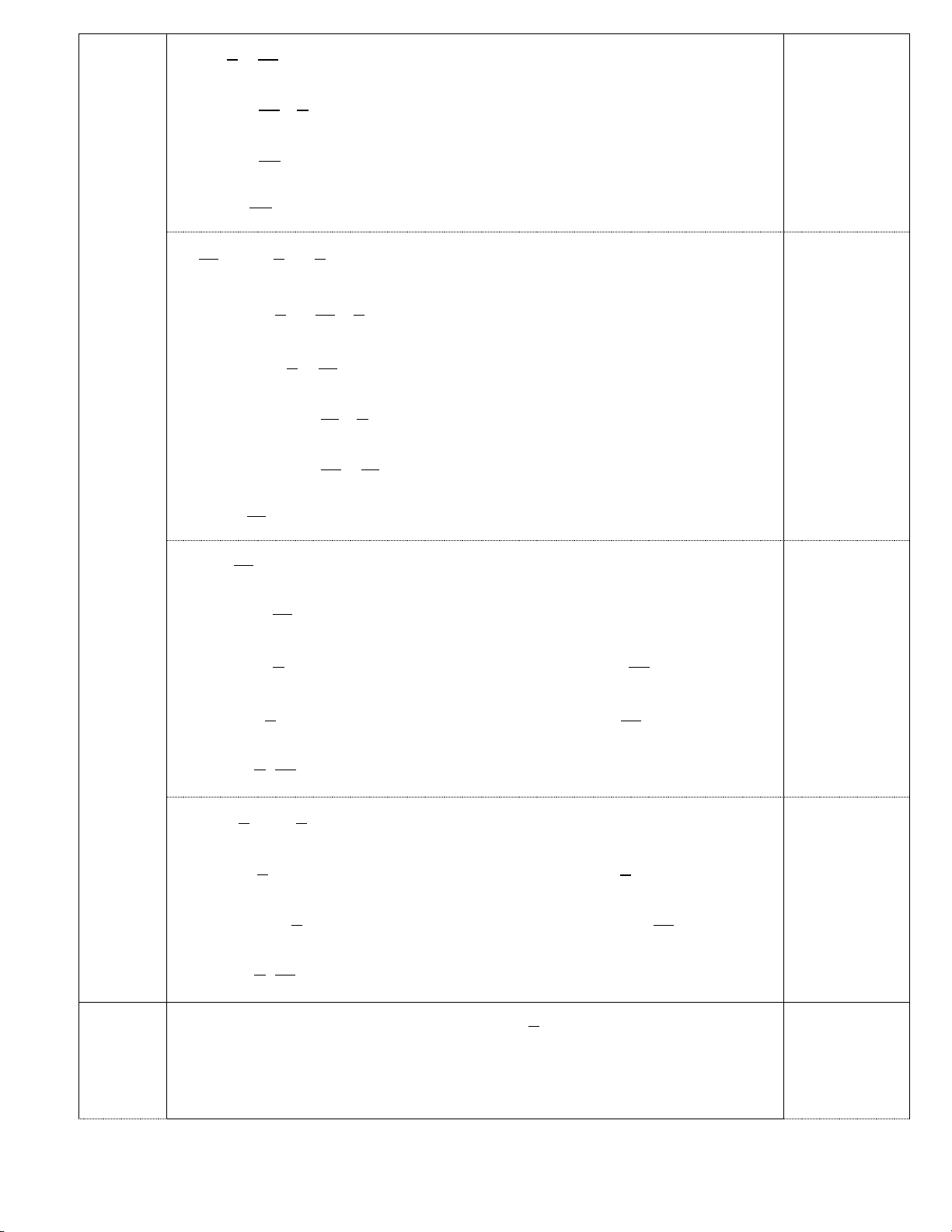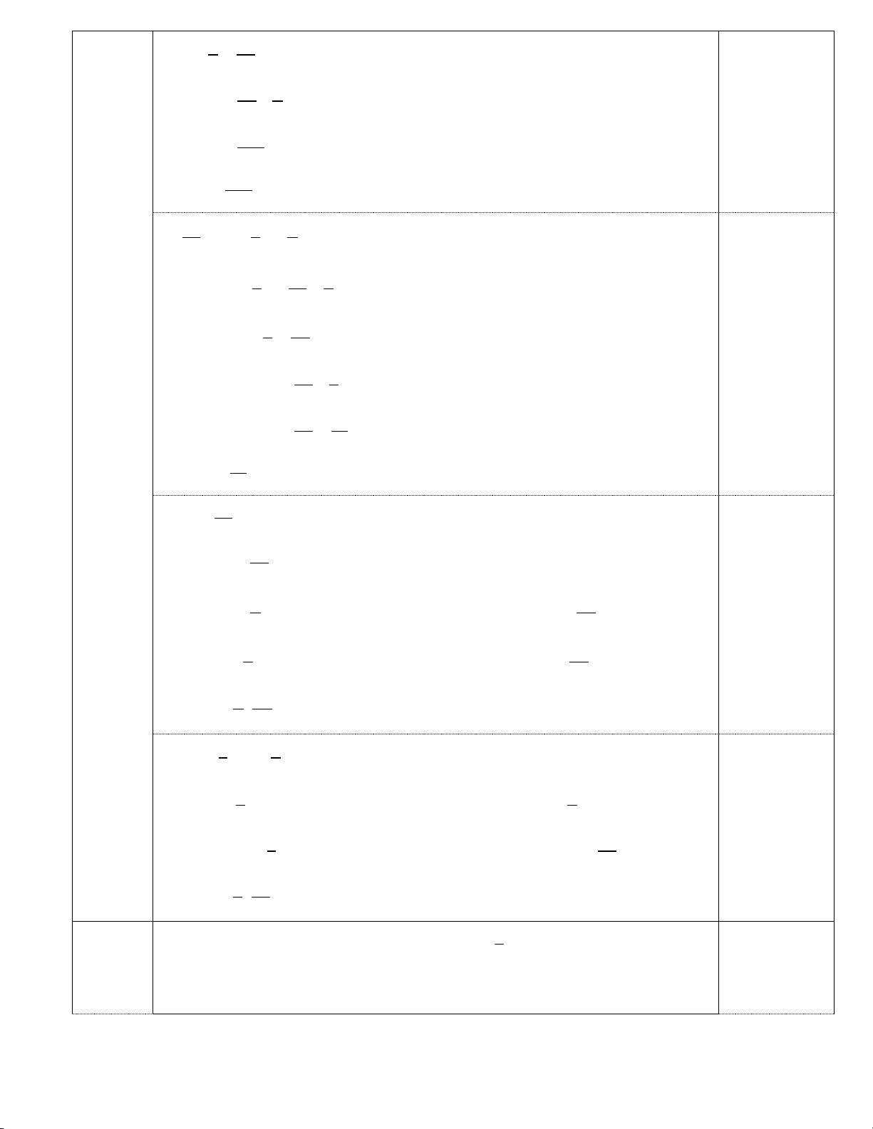 II. TỰ LUẬN: (8,0 điểm) Bài Lời giải Điểm Bài 1 2 − a + 0,5 (2đ) ) 7 2 − 1 0,25 = + 7 2 3 = 0,25 14 3 1 2 8 − b) + : 3 7 7 1 2 7 − = + . 0,25 27 7 8 1 1 − = + 27 4 23 − = 0,25 108 5 41 c) 2,5 − 2,5 6 6 5 41 0,25 = 2,5 − 6 6 = 2,5.( 6) − = −15 0,25 2 2 − 1 3 d ) − 4. + 3 2 4 4 5 = − 4. 0,25 9 4 4 = − 5 9 −41 = 0,25 9 Bài 2 2 3 − + = (2đ) a) x 5 10 3 − 2 0,25 x = − 10 5 7 − x = 10 − 0,25 Vậy 7 x = 10 15 3 7 b) − x − = 4 4 6 3 15 7 x − = − 0,25 4 4 6 3 31 x − = 4 12 31 3 x = + 12 4 40 10 x = = 12 3 0,25 Vậy 10 x = 3 9 2 c) x − = 0 16 9 0,25 2 x = 16 2 3 2 3 − 2 x = 2 x = TH1: 4 TH2: 4 0,25 3 3 − x = x = 4 4 3 3 − Vậy x ;
