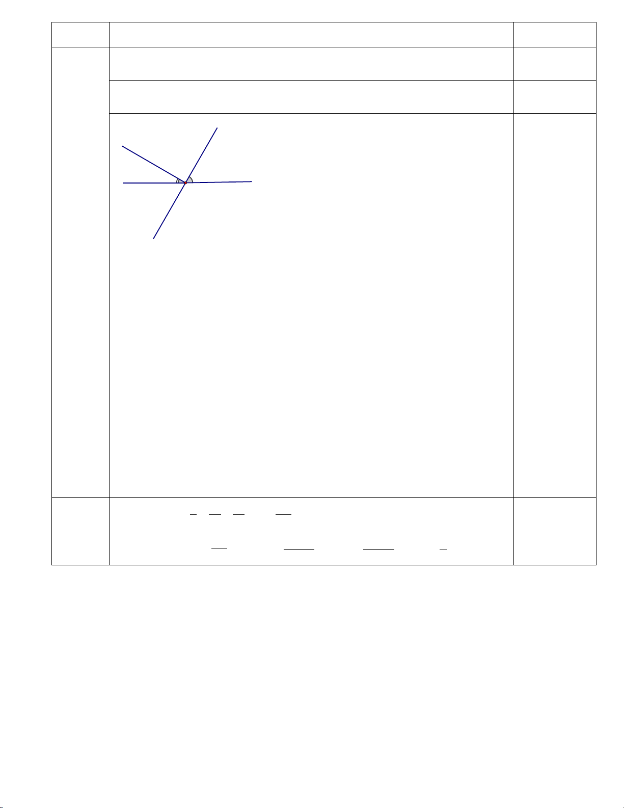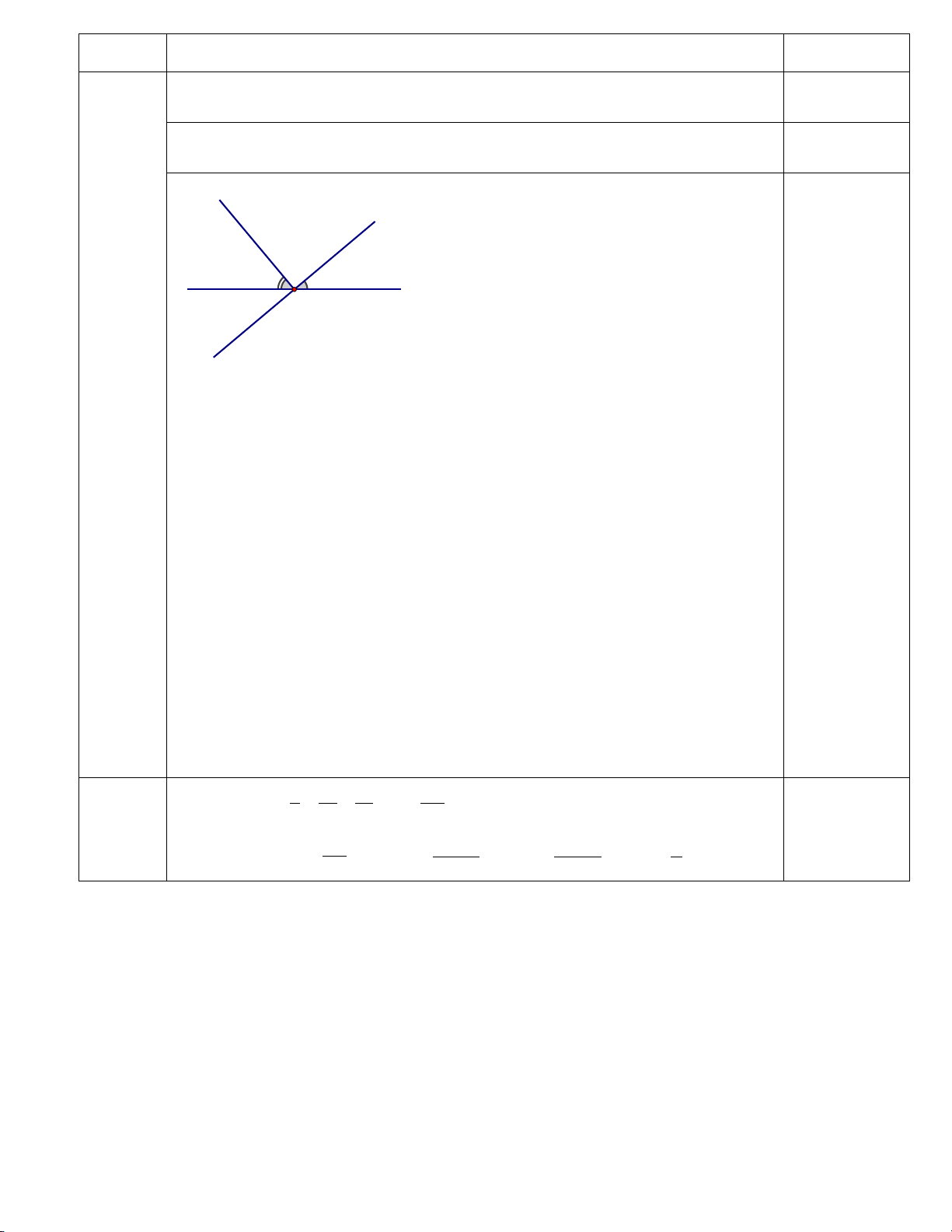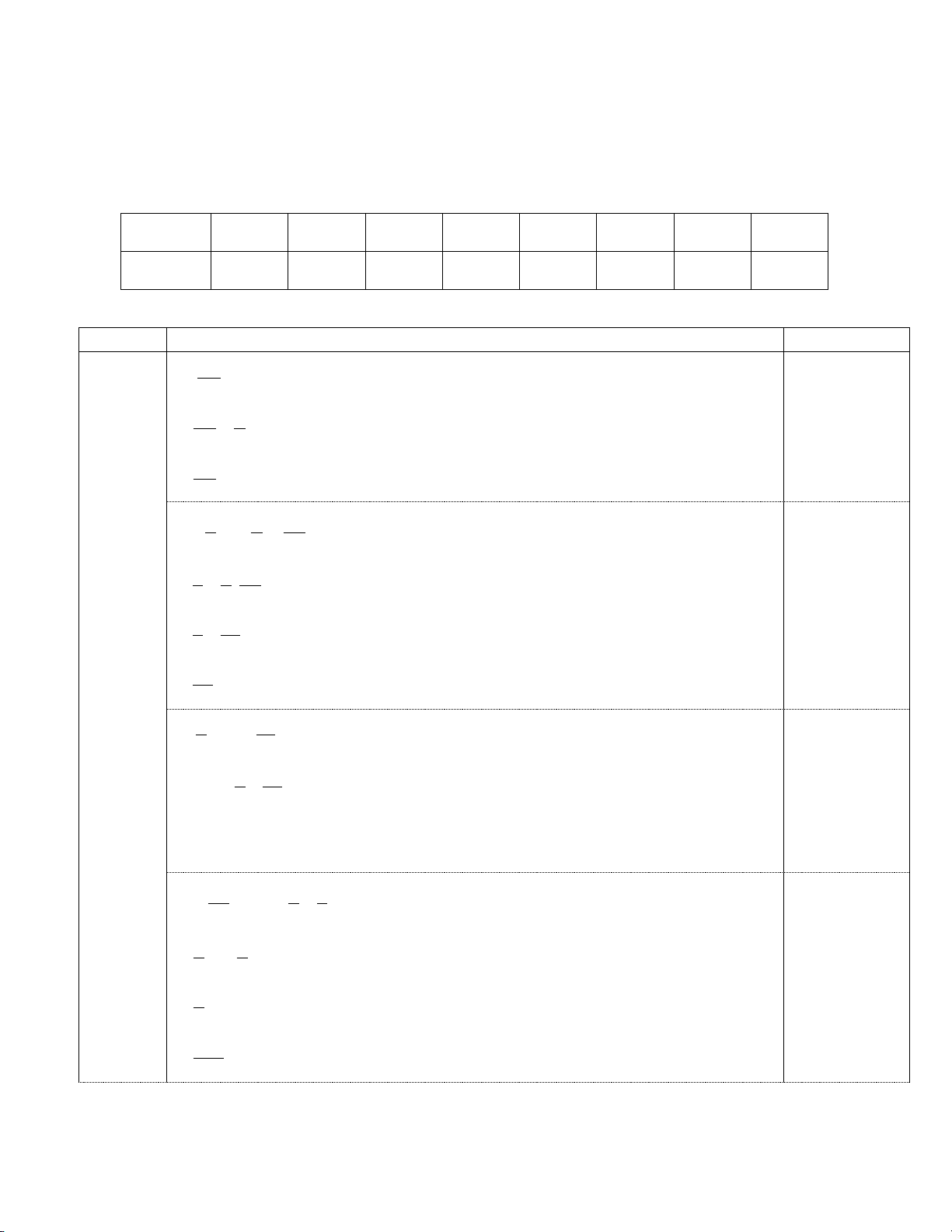 II. TỰ LUẬN: (8,0 điểm) Bài Lời giải Điểm Bài 1 2 − a + 0,5 (2đ) ) 7 2 − 1 0,25 = + 7 2 3 = 0,25 14 3 1 2 8 − b) + : 3 7 7 1 2 7 − = + . 0,25 27 7 8 1 1 − = + 27 4 23 − = 0,25 108 5 41 c) 2,5 − 2,5 6 6 5 41 0,25 = 2,5 − 6 6 = 2,5.( 6) − = −15 0,25 2 2 − 1 3 d ) − 4. + 3 2 4 4 5 = − 4. 0,25 9 4 4 = − 5 9 −41 = 0,25 9 Bài 2 2 3 − + = (2đ) a) x 5 10 3 − 2 0,25 x = − 10 5 7 − x = 10 − 0,25 Vậy 7 x = 10 15 3 7 b) − x − = 4 4 6 3 15 7 x − = − 0,25 4 4 6 3 31 x − = 4 12 31 3 x = + 12 4 40 10 x = = 12 3 0,25 Vậy 10 x = 3 9 2 c) x − = 0 16 9 0,25 2 x = 16 2 3 2 3 − 2 x = 2 x = TH1: 4 TH2: 4 0,25 3 3 − x = x = 4 4 3 3 − Vậy x ;