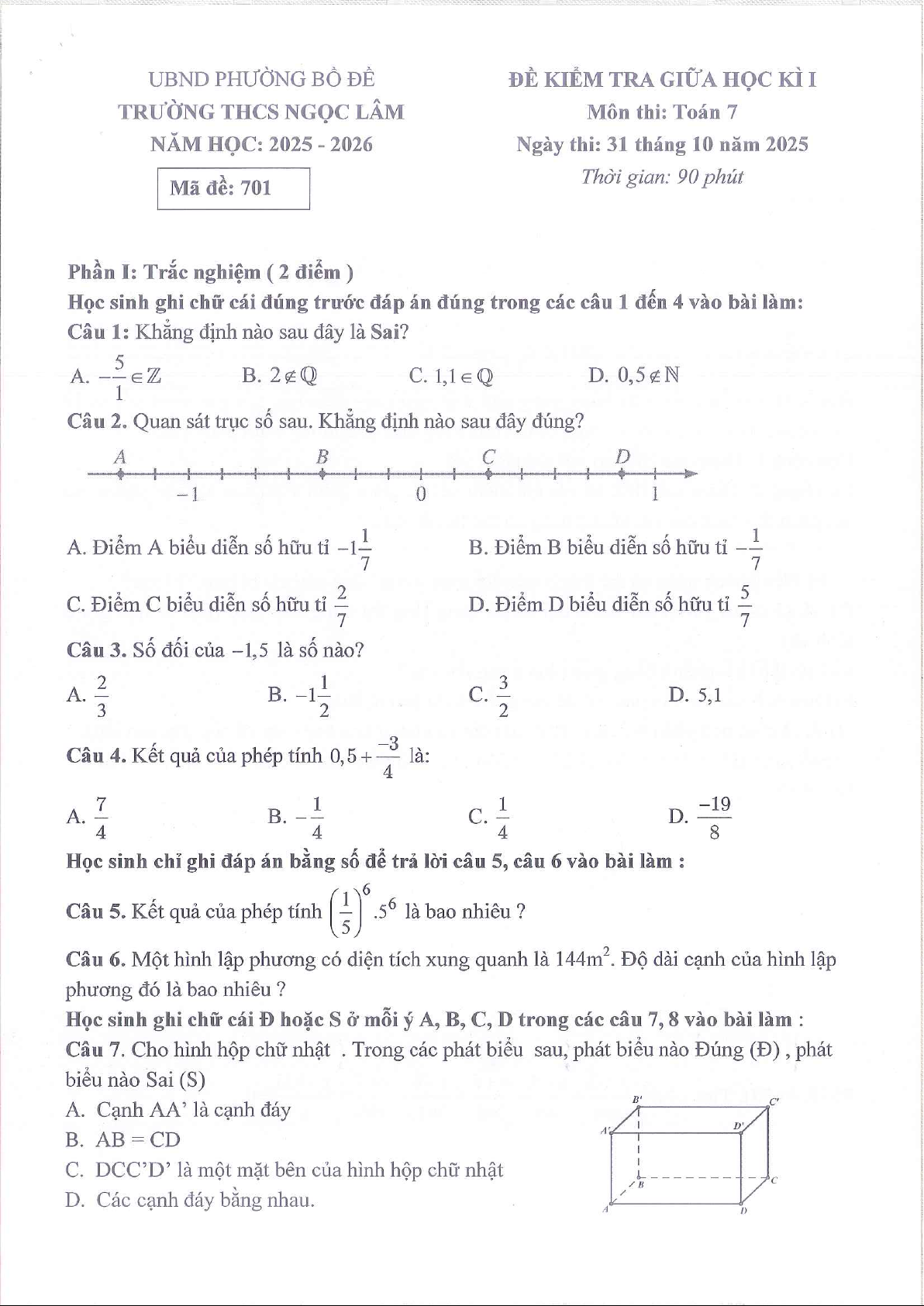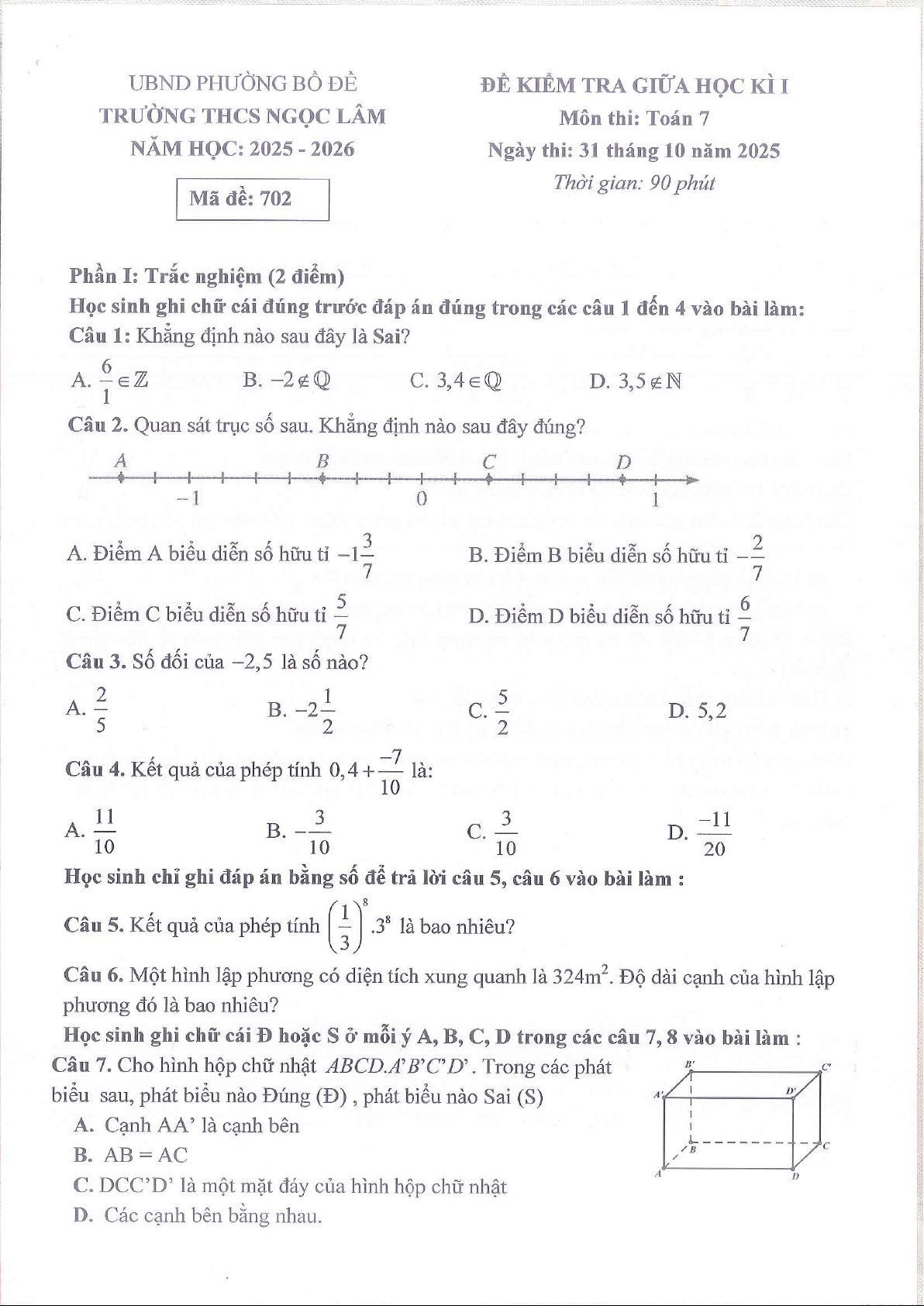 Đề giữa kì 1 Toán 7 năm 2025 – 2026 trường THCS Ngọc Lâm – Hà Nội