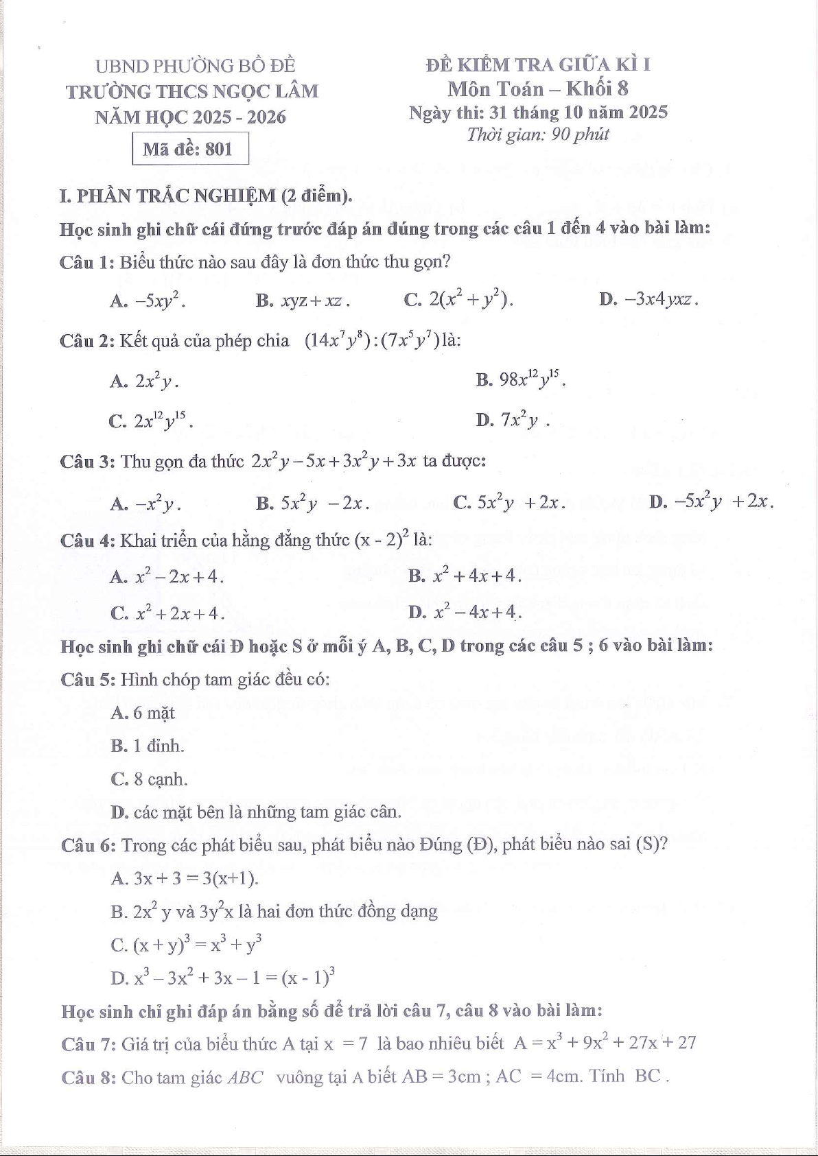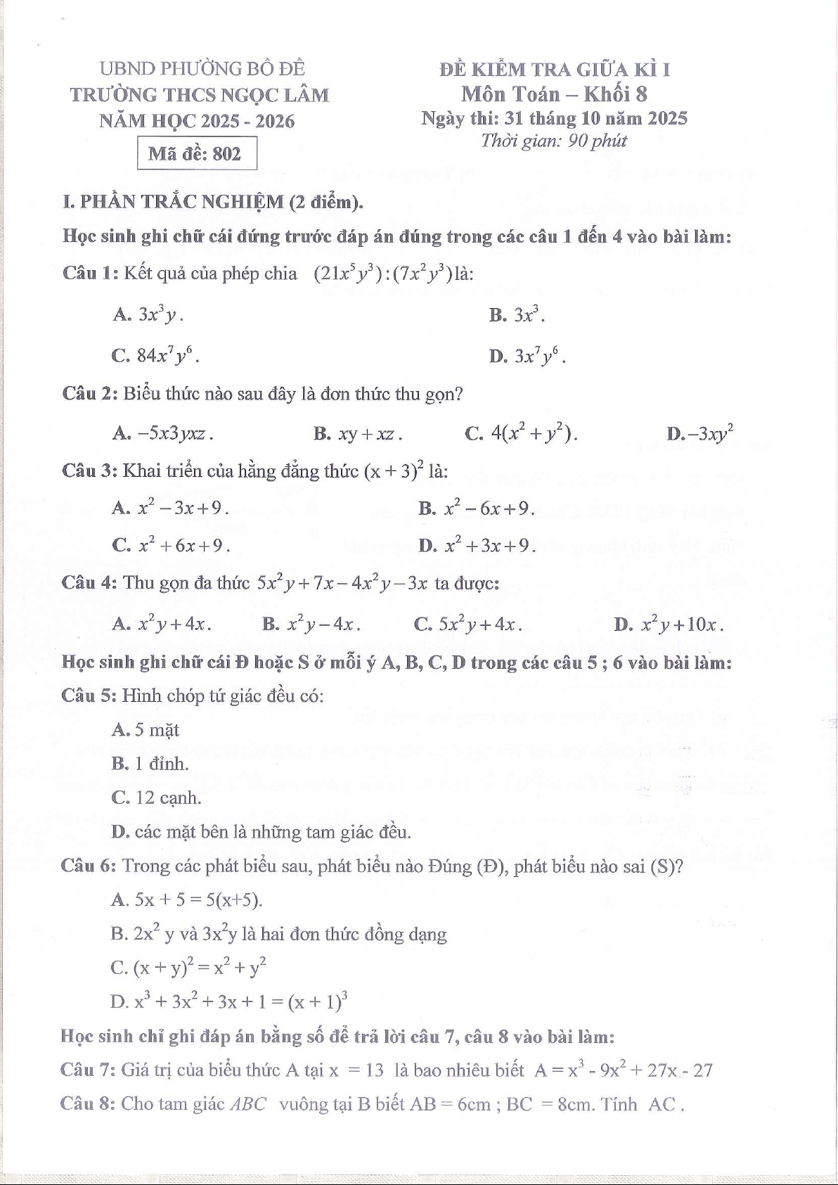 Đề thi giữa kì 1 Toán 8 năm 2025 – 2026 trường THCS Ngọc Lâm – Hà Nội