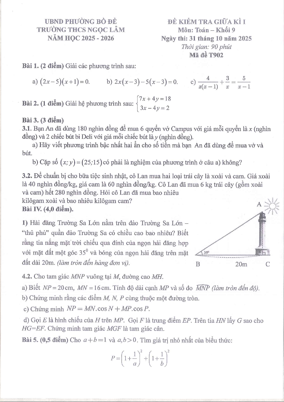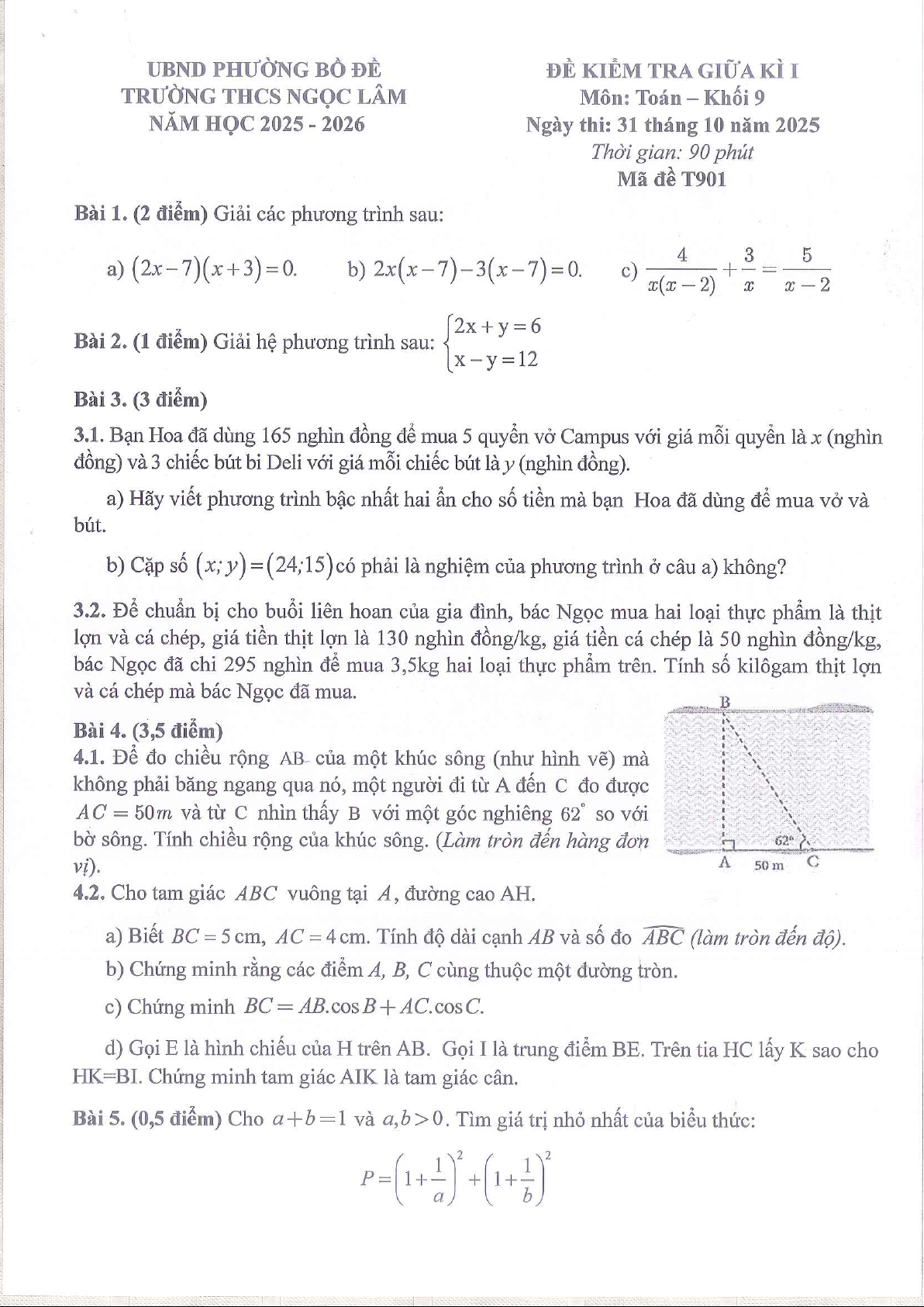Xin giới thiệu đến quý thầy, cô giáo và các em học sinh đề chính thức kiểm tra giữa học kì 1 môn Toán 9 năm học 2025 – 2026 trường THCS Ngọc Lâm, phường Bồ Đề, thành phố Hà Nội. Kỳ thi được diễn ra vào ngày 31 tháng 10 năm 2025.