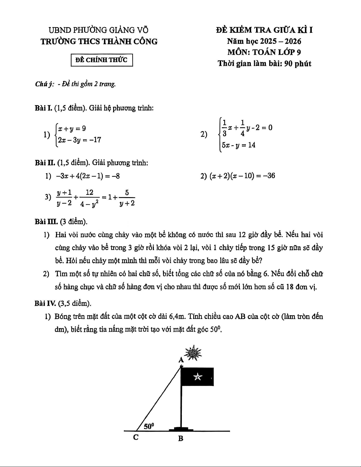 Xin giới thiệu đến quý thầy, cô giáo và các em học sinh đề kiểm tra giữa học kì 1 môn Toán 9 năm học 2025 – 2026 trường THCS Thành Công, phường Giảng Võ, thành phố Hà Nội. Đề thi gồm 02 trang với 05 bài toán dạng tự luận, thời gian làm bài 90 phút.