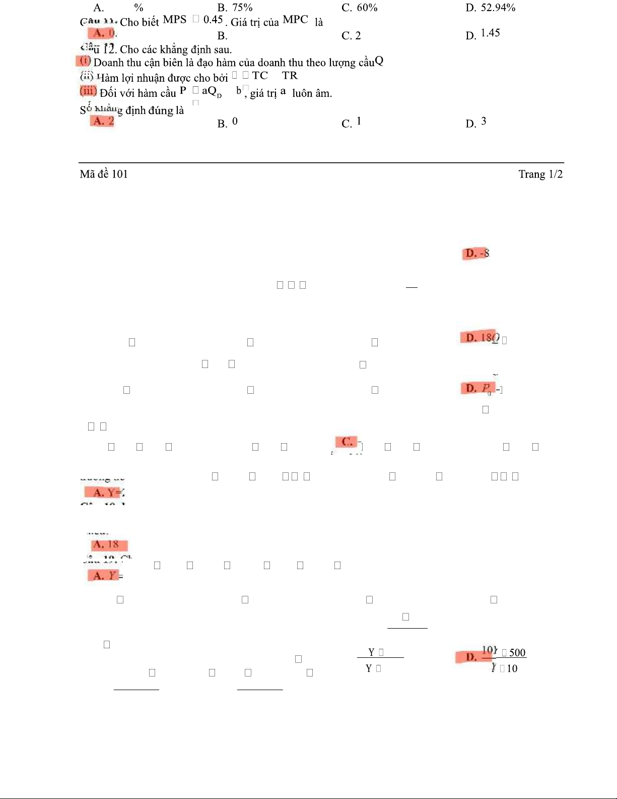 Câu 4. Cho hàm cầu P Q 100 và hàm tổng chi phí TC 0.5Q2 80Q 7 . Tìm Q để lợi nhuận đạt cực đại. A. 6.67 B. 4.8 C. 13.33 D. 10