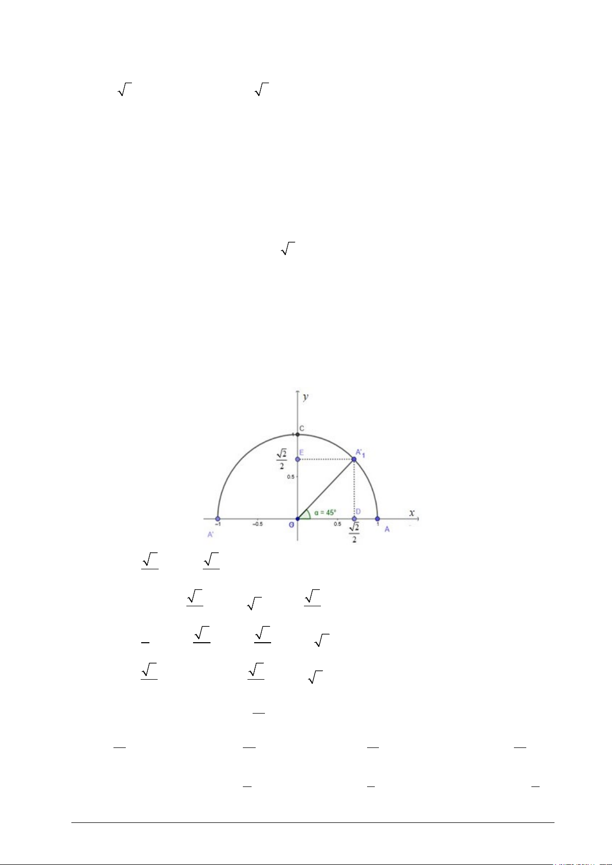 Câu 10. Trên nửa đường tròn đơn vị, cho góc α như hình vẽ. Hãy chỉ ra các giá trị lượng giác của góc . α A. 2 2 sin α = ;cosα = ;tan α =1;cot α =1. 2 2 B. 2 2 sin α =1;cosα = ;tan α = 2;cot α = . 2 2 C. 1 2 2 sin α = ;cosα = ;tan α = ;cot α = 2. 2 2 2 D. 2 2 sin α = ;cosα =1;tan α = ;cot α = 2. 2 2