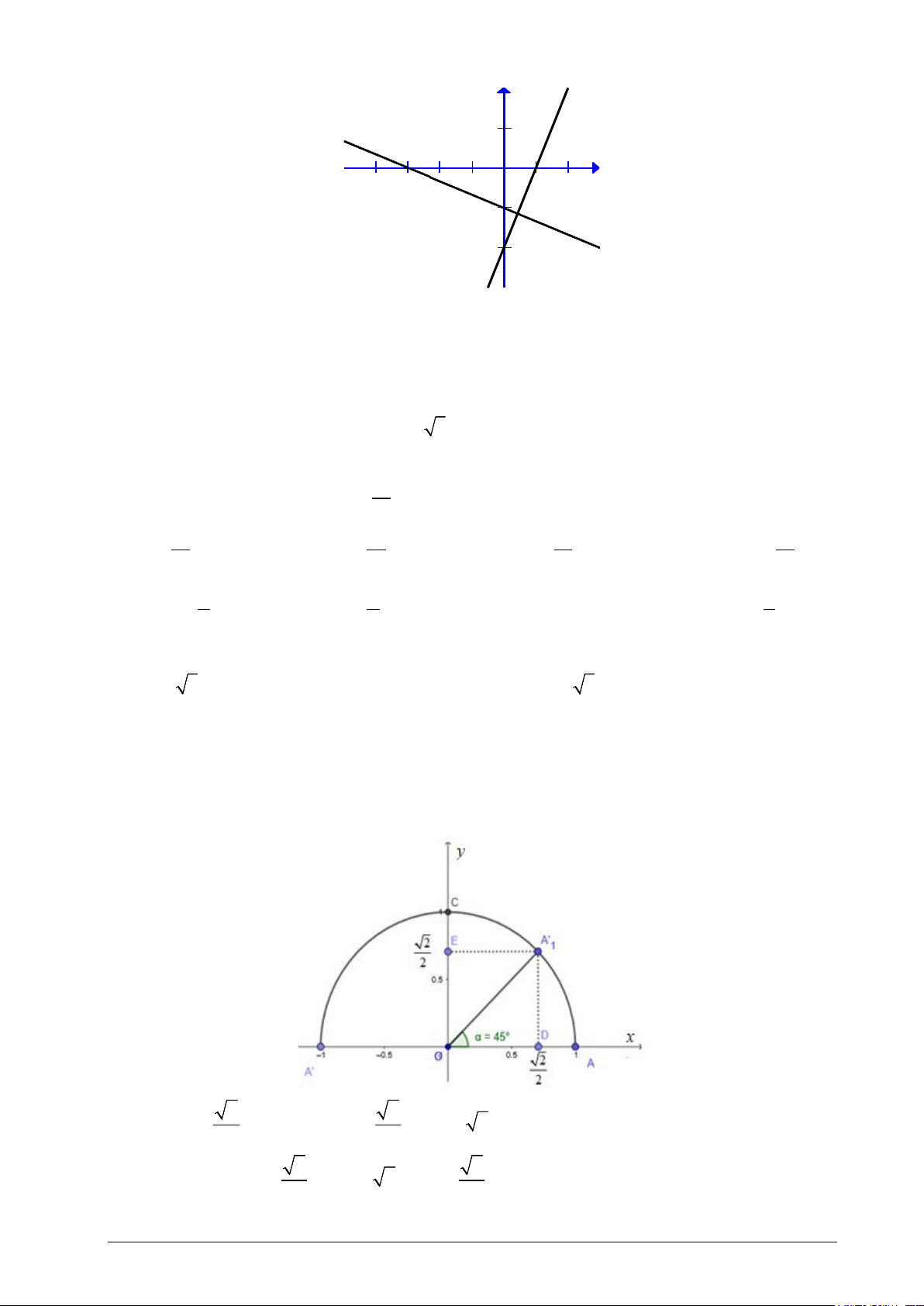 Câu 12. Trên nửa đường tròn đơn vị, cho góc α như hình vẽ. Hãy chỉ ra các giá trị lượng giác của góc . α A. 2 2 sin α = ;cosα =1;tan α = ;cot α = 2. 2 2 B. 2 2 sin α =1;cosα = ;tan α = 2;cot α = . 2 2 Mã đề 002 Trang 2/4 C. 2 2 sin α = ;cosα = ;tan α =1;cot α =1. 2 2 D. 1 2 2 sin α = ;cosα = ;tan α = ;cot α = 2. 2 2 2