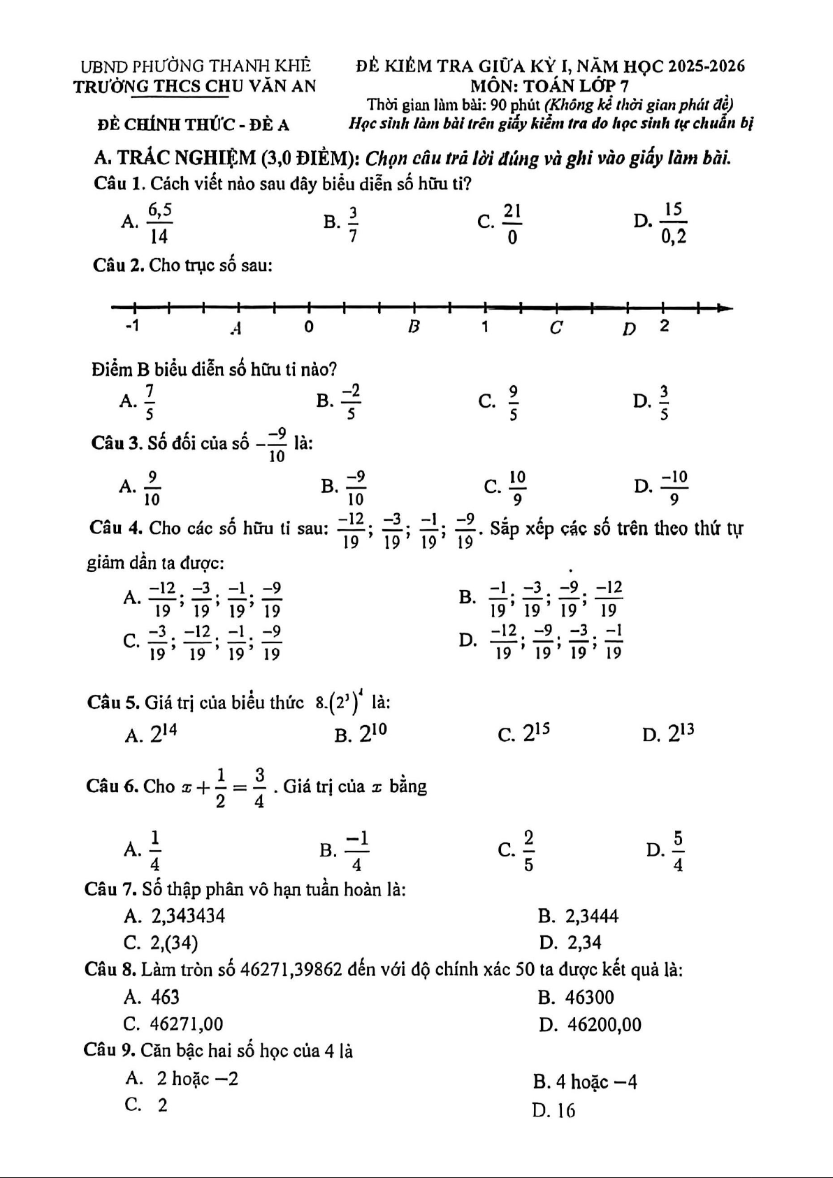Xin giới thiệu đến quý thầy, cô giáo và các em học sinh đề kiểm tra giữa học kỳ 1 môn Toán 7 năm học 2025 – 2026 trường THCS Chu Văn An, phường Thanh Khê, thành phố Đà Nẵng. Đề thi hình thức 30% trắc nghiệm kết hợp 70% tự luận, thời gian làm bài 90 phút.