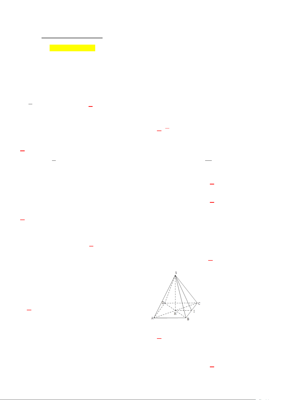 Câu 9. Cho hình vẽ bên, trung đoạn của hình chóp tứ giác đều S.ABCD là đoạn thẳng: A. SI. B. SA. C. SH. D. HI.