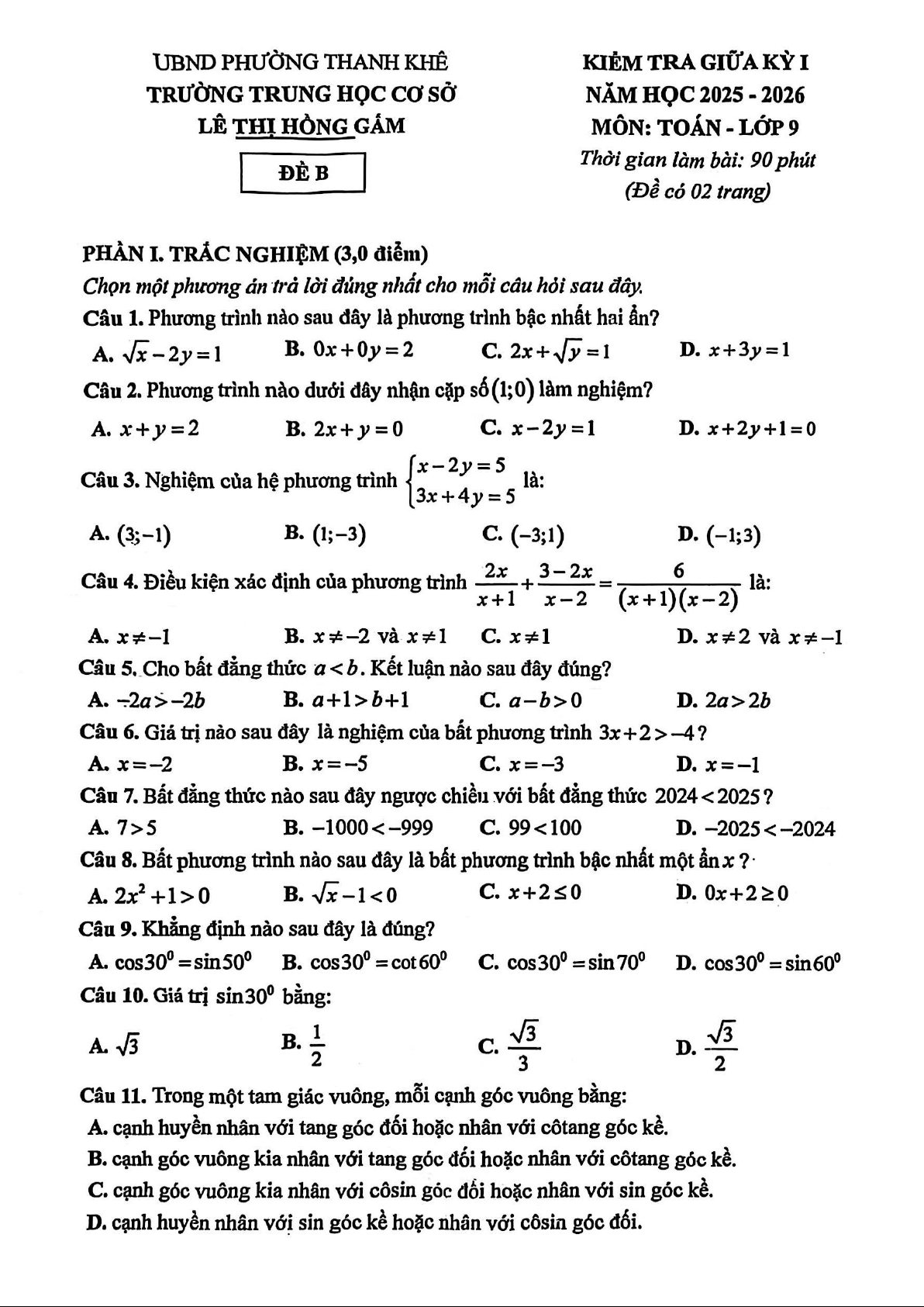 Xin giới thiệu đến quý thầy, cô giáo và các em học sinh đề kiểm tra giữa học kỳ 1 môn Toán 9 năm học 2025 – 2026 trường THCS Lê Thị Hồng Gấm, phường Thanh Khê, thành phố Đà Nẵng. Đề thi gồm 02 trang, hình thức 30% trắc nghiệm kết hợp 70% tự luận, thời gian làm bài 90 phút.