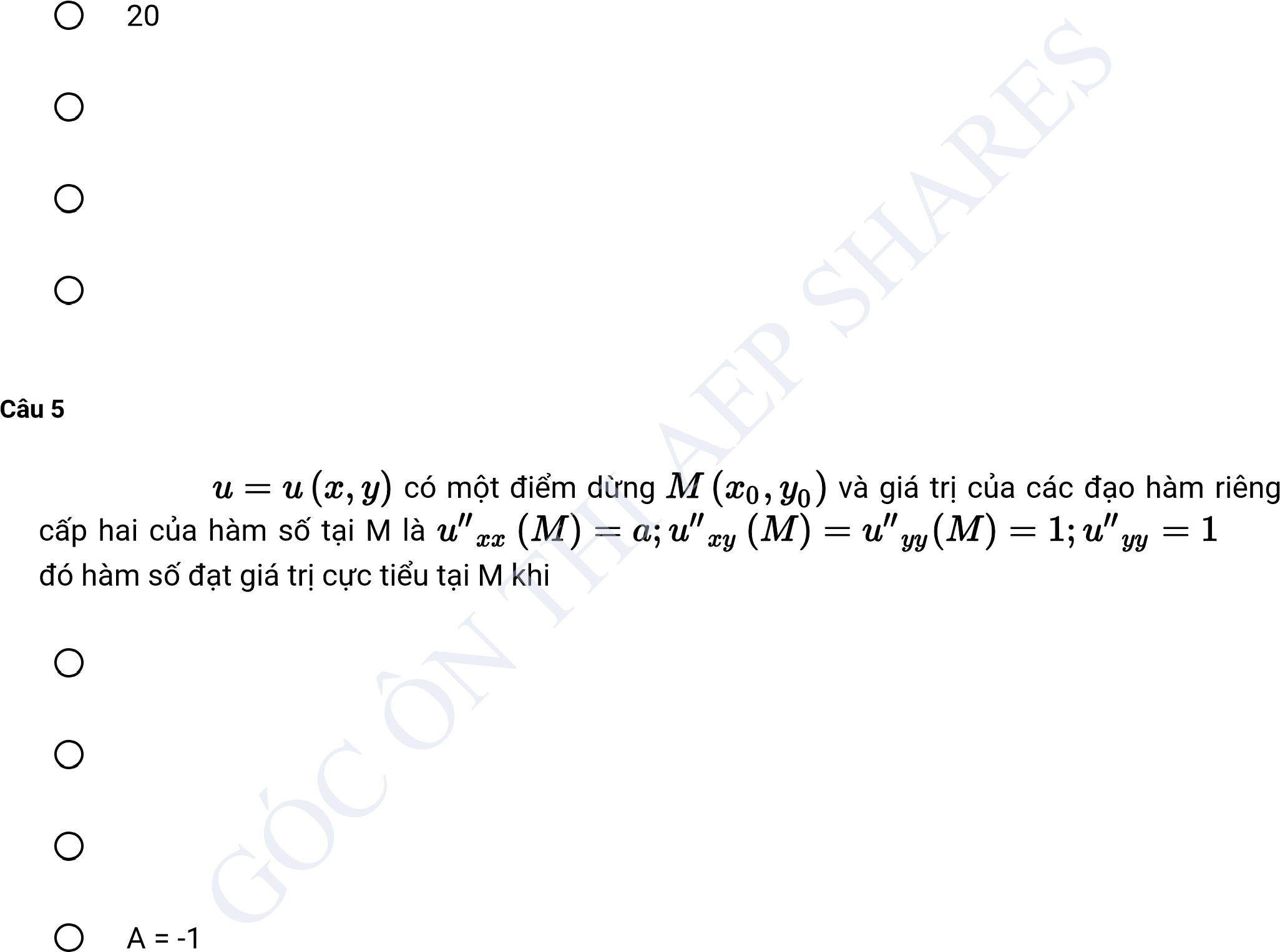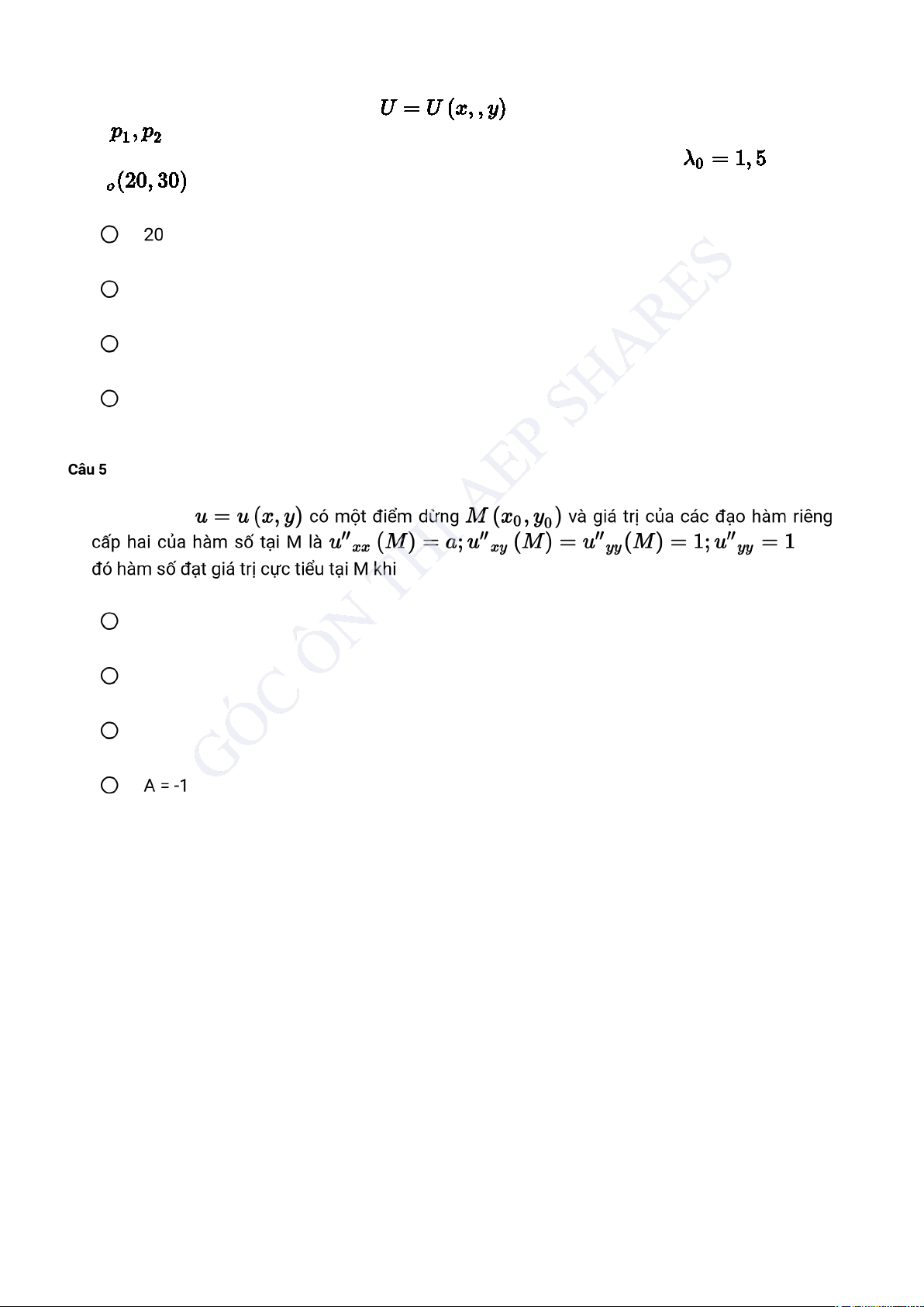 Xét bài toán “Cho hàm lợi ích tiêu dùng . Biết rằng giá bán hàng hoá thứ nhất là . Thu nhập dành cho tiêu dùng là m. Xác định cơ cấu mua sắm để người tiêu dùng thu được lợi ích tối đa. Khi giải bài toán trên bằng pp nhân tử Lagrange, ta được điểm cực đại M ứng với . Nếu thu nhập cho tiêu dùng tăng thêm 1 đô-la thì lợi ích cực đại tăng xấp xỉ là: