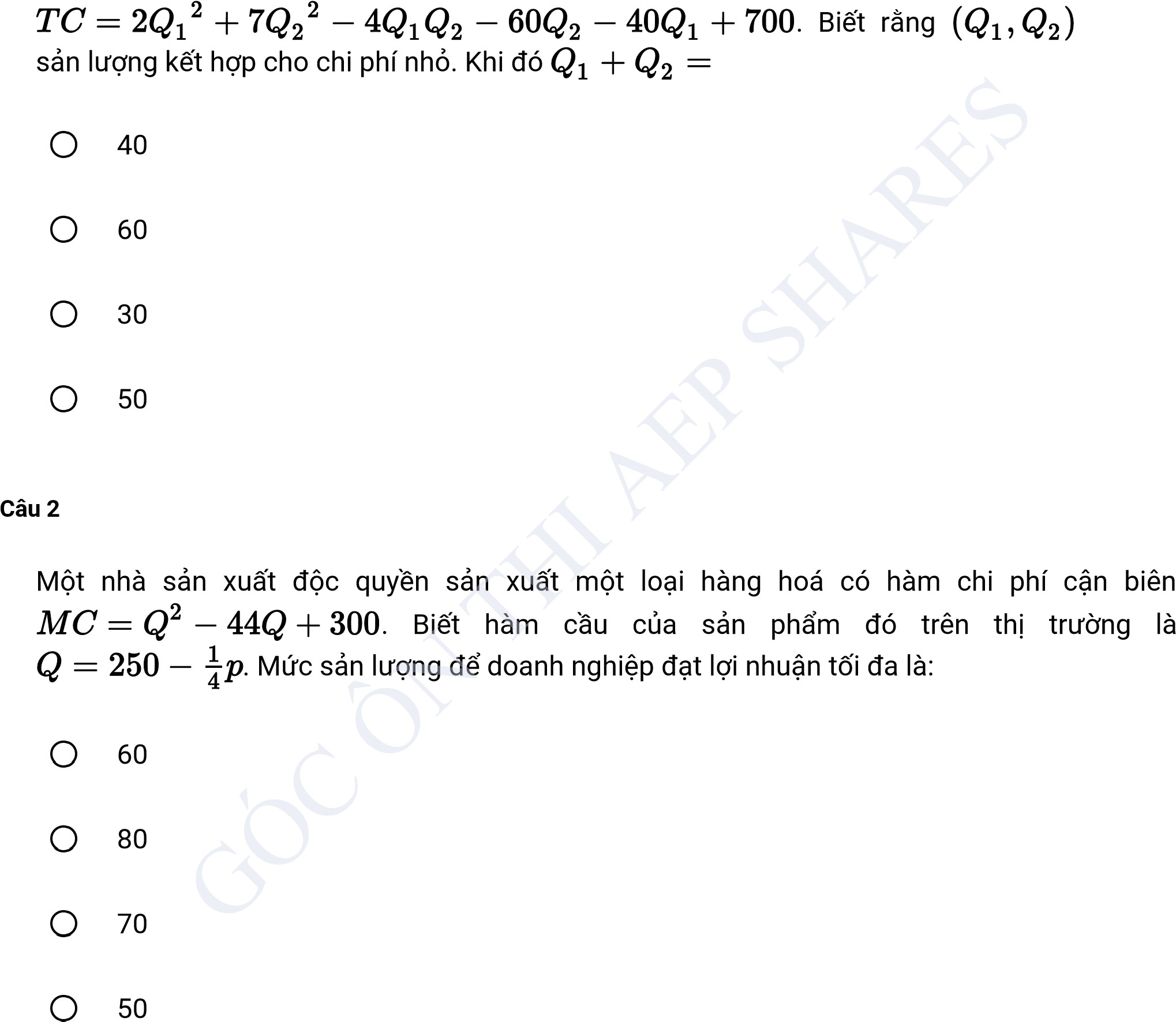 Một doanh nghiệp cạnh tranh tuần tuý sản xuất kết hợp 2 loại sản phẩm với hàm chi phí
