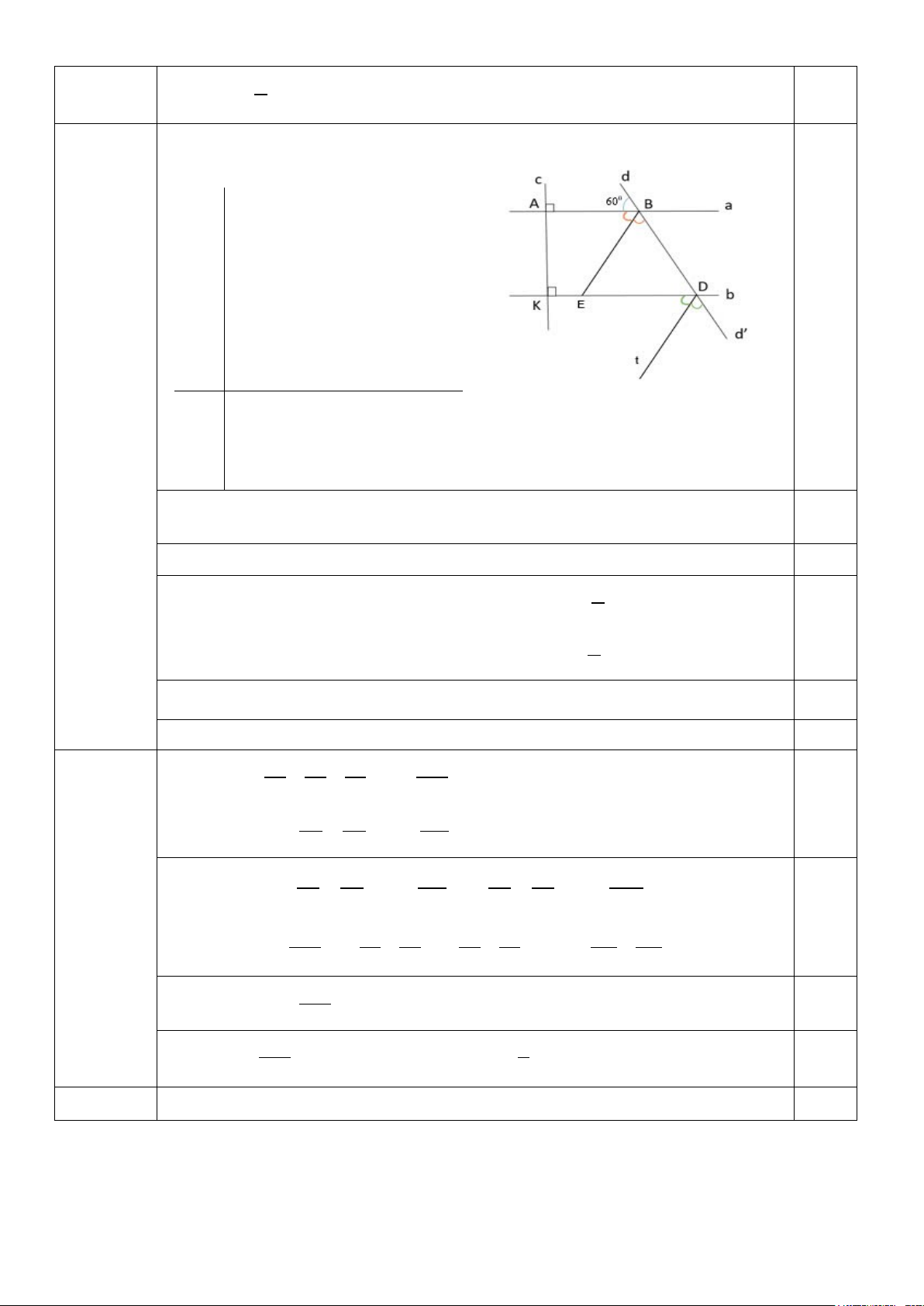 a ) Viết giả thiết đúng được 0,5 điểm, vẽ hình đúng được 0,5 điểm c ⊥ a tại A c ⊥ b tại K 1,0 dd’ cắt a tại B dd’cắt b tại D GT ABd = 60° BE là tia phân giác của ABD ( E ∈ KD); Dt là tia phân giác của KDd' . KL a) Vẽ hình, ghi GT, KL. Câu 12 b) AB//KD ; BDK =? (3,0đ) c) BE và Dt có song song với nhau không? Vì sao?