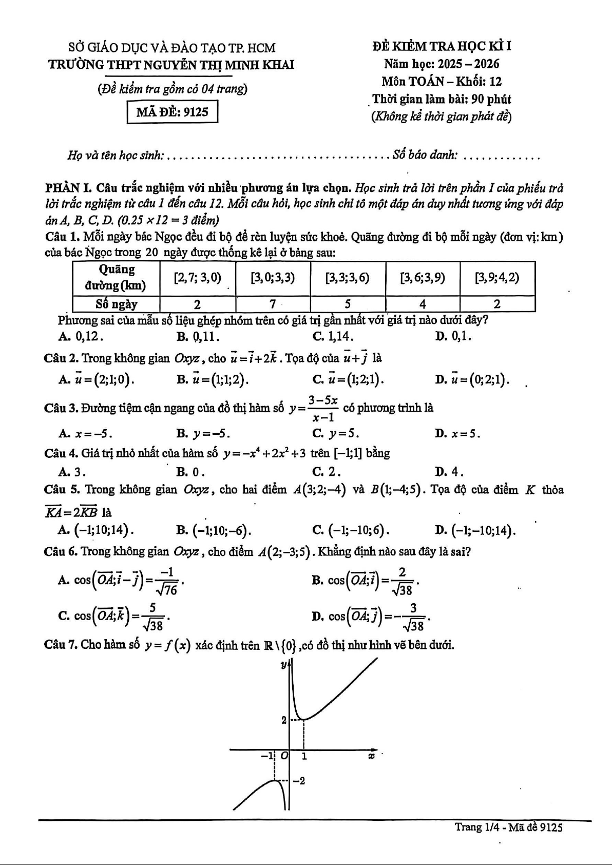 Đề HK1 toán 12 năm 2025-2026 THPT Nguyễn Thị Minh Khai Tp HCM