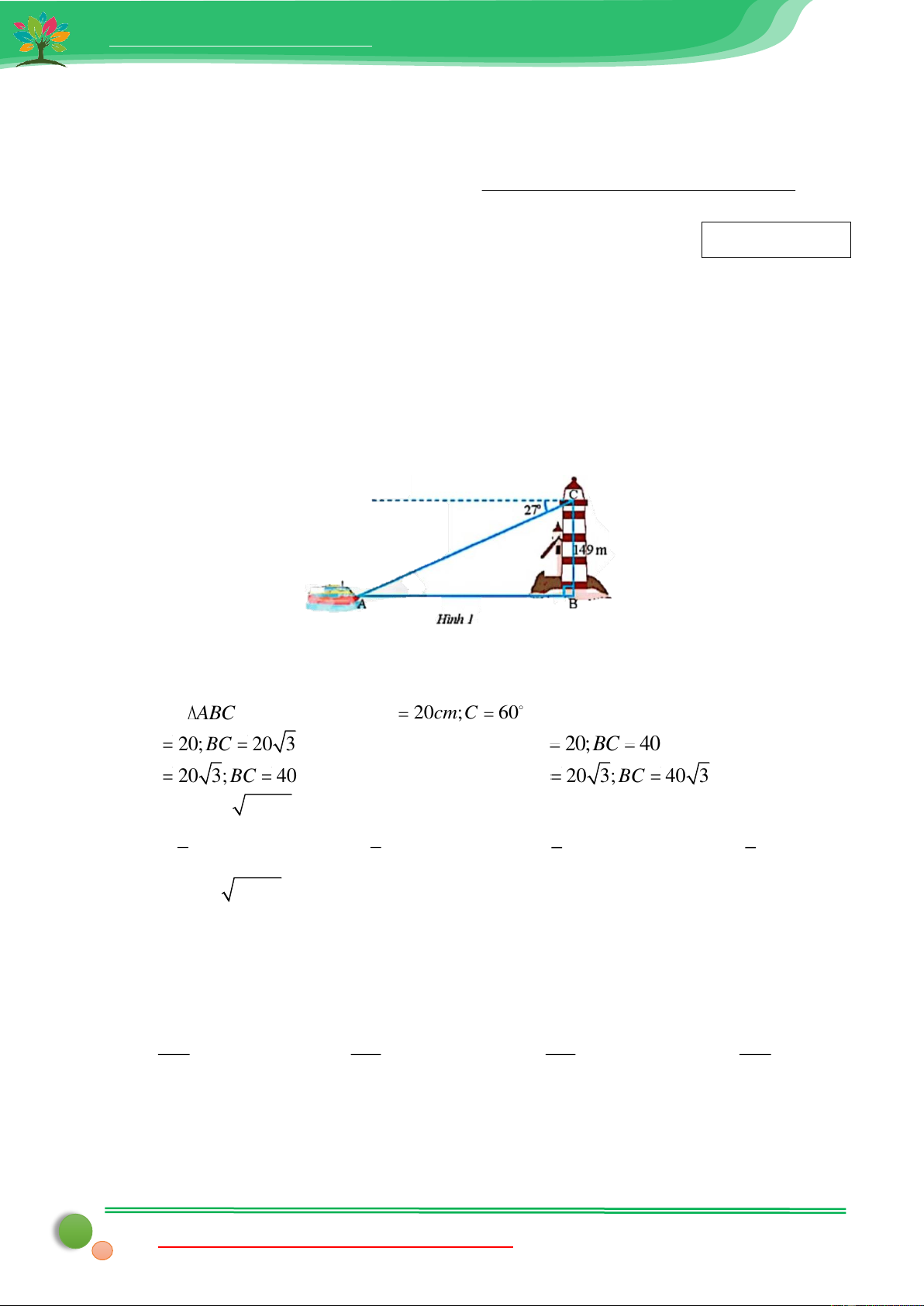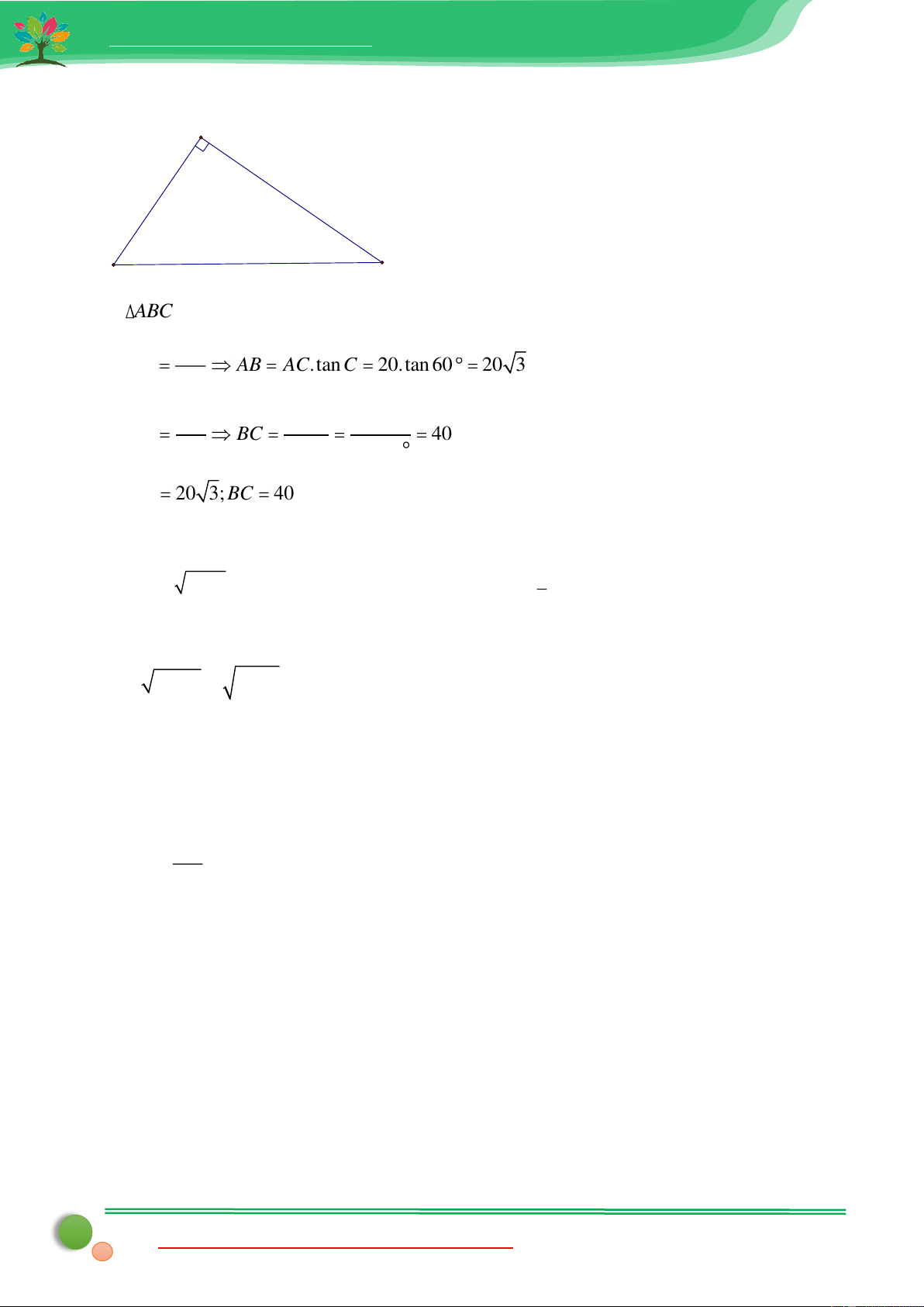 Xét ABC vuông tại A có AB tan C AB AC.tan C 20.tan 60 20 3 AC AC AC 20 cos C BC 40 BC cos C cos 60 Vậy AB 20 3; BC 40 Câu 4: C Lời giải: