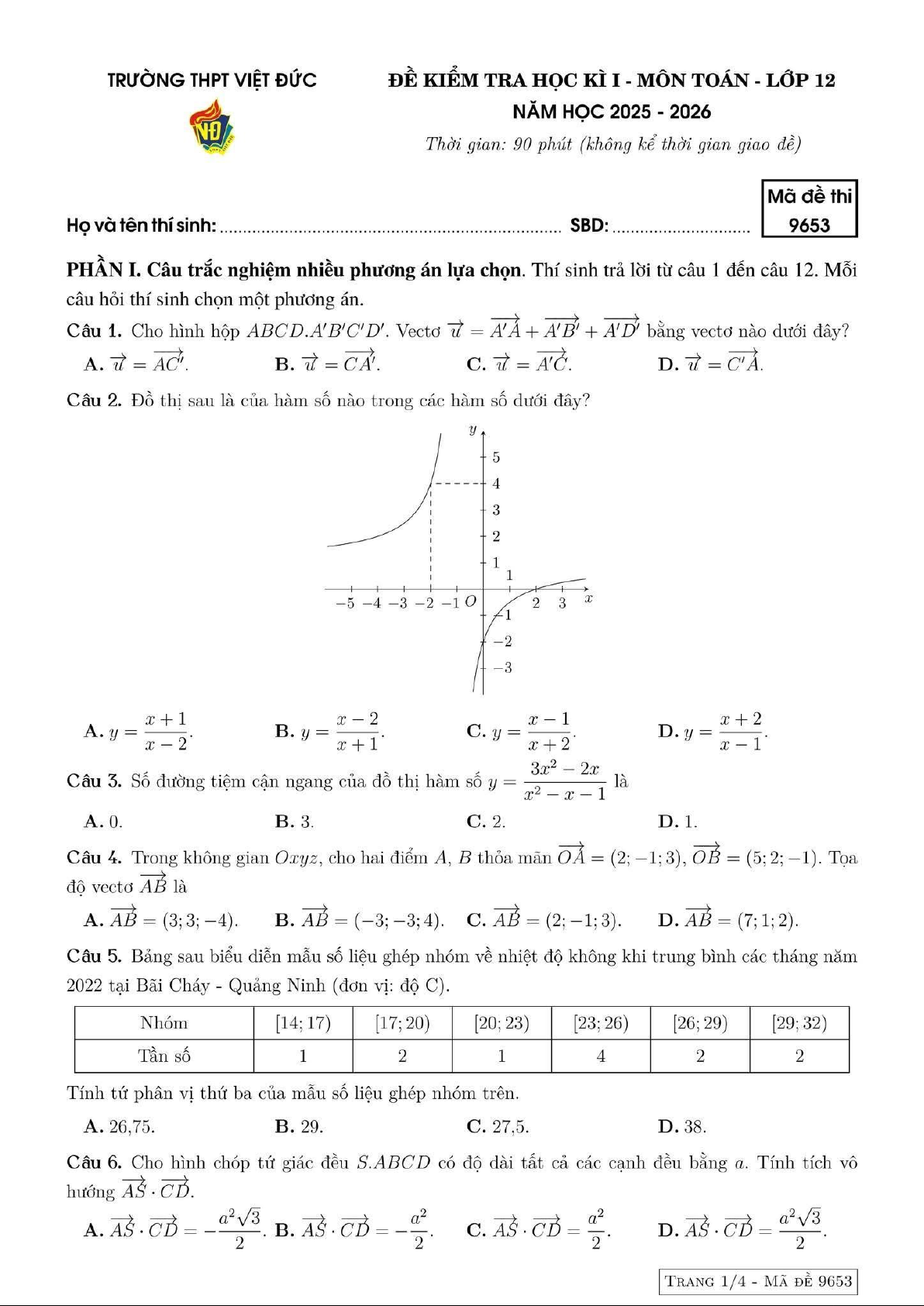 Xin giới thiệu đến quý thầy, cô giáo và các em học sinh đề kiểm tra cuối học kì 1 môn Toán 12 năm học 2025 – 2026 trường THPT Việt Đức, thành phố Hà Nội. Đề thi mã đề 9653, gồm 12 câu trắc nghiệm nhiều phương án lựa chọn (3,0 điểm) + 04 câu trắc nghiệm đúng sai (4,0 điểm) + 06 câu trắc nghiệm trả lời ngắn (3,0 điểm), thời gian làm bài 90 phút.