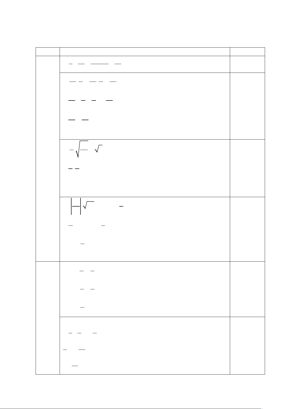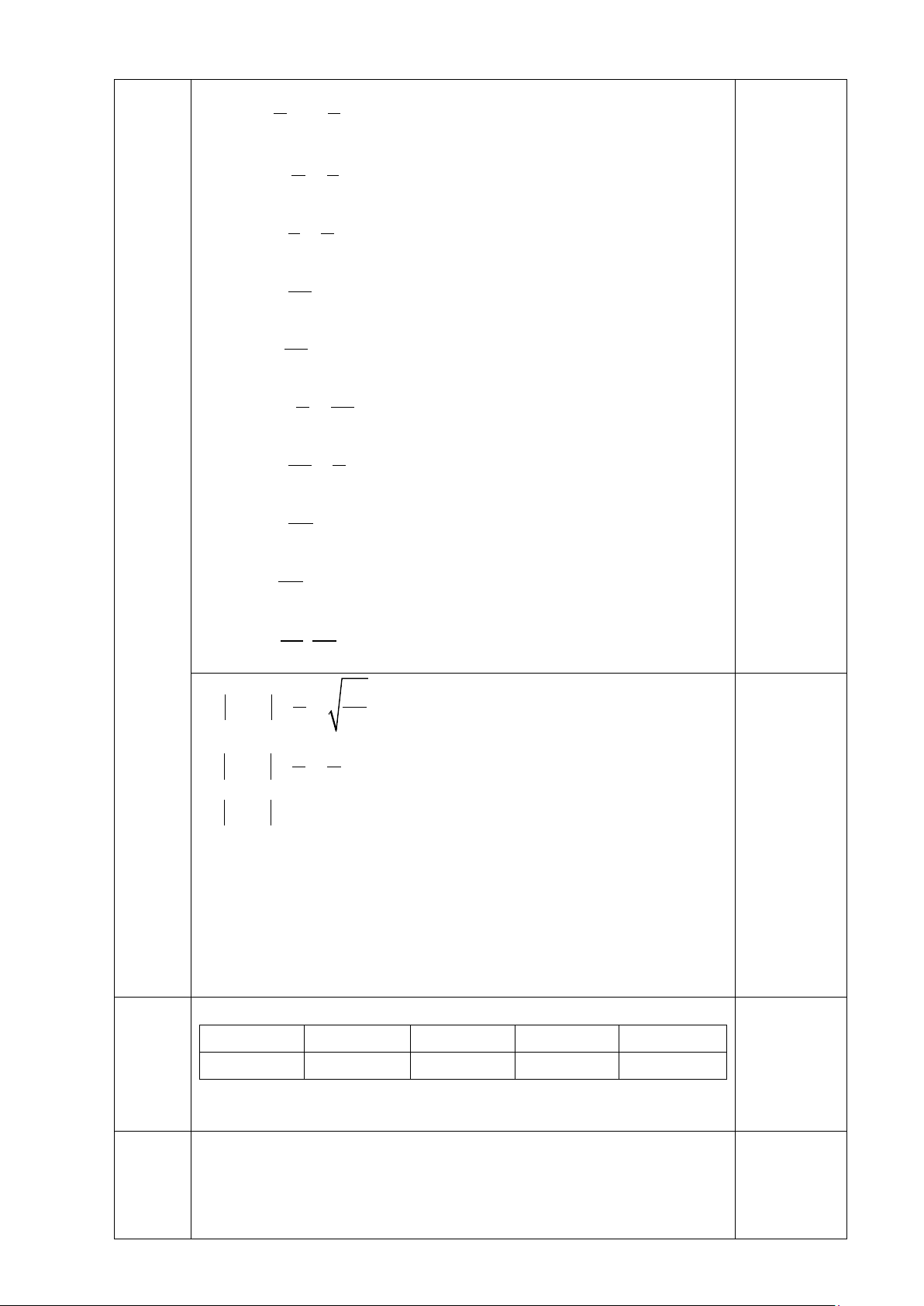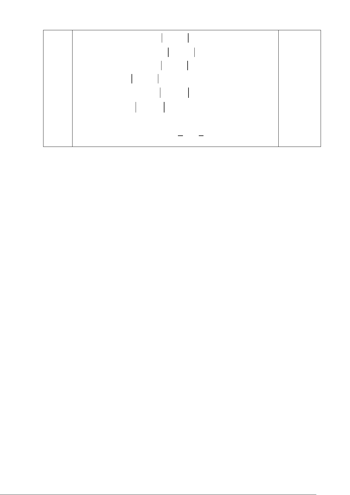 HƯỚNG DẪN CHẤM VÀ BIỂU ĐIỂM ĐỀ KIỂM TRA HỌC KÌ 1 MÔN TOÁN 7 Câu Đáp án Biểu điểm 1 4 − 1+ ( 4) − 3 a) − + = = 0,5đ 5 5 5 5 8 1 8 3 5 b) . + . + 13 4 13 4 13 8 1 3 5 = . + + 13 4 4 13 0,25đ 8 5 = + 13 13 0,25đ =1 6 25 c) . − 9 5 4 6 5 = . − 3 0,25đ 5 2 = 3 − 3 0,25đ = 0 Bài 1 3 − 3 d) . 64 − 0,125: + ( 2024 − )0 (2,0 2 8 điểm) 3 8 = .8 − 0,125. +1 2 3 0,25đ 1 =12 − +1 3 0,25đ =12 7 1 a) x − = 6 3 1 7 x = + 3 6 0,25đ 3 x = 0,25đ 2 Bài 2 (2,0 1 4 3 b) + ⋅ x = điểm) 5 5 4 0,25đ 4 11 ⋅ x = 5 20 0,25 11 x = 16 2 1 1 c) 3x + = 2 9 1 1 TH1:3x + = 2 3 1 1 3x = − 3 2 1 3x − = 6 1 x − = 18 0.25đ 1 1 TH 2:3x − + = 2 3 1 − 1 3x = − 3 2 5 3x − = 6 5 x − = 18 − 0,25đ Vậy 1 5 x − ; ∈ 18 18 1 36 d) 2 − x − = 7 49 1 6 0,25đ 2 − x − = 7 7 2 − x =1 TH1: 2 − x =1 0,25đ x =1