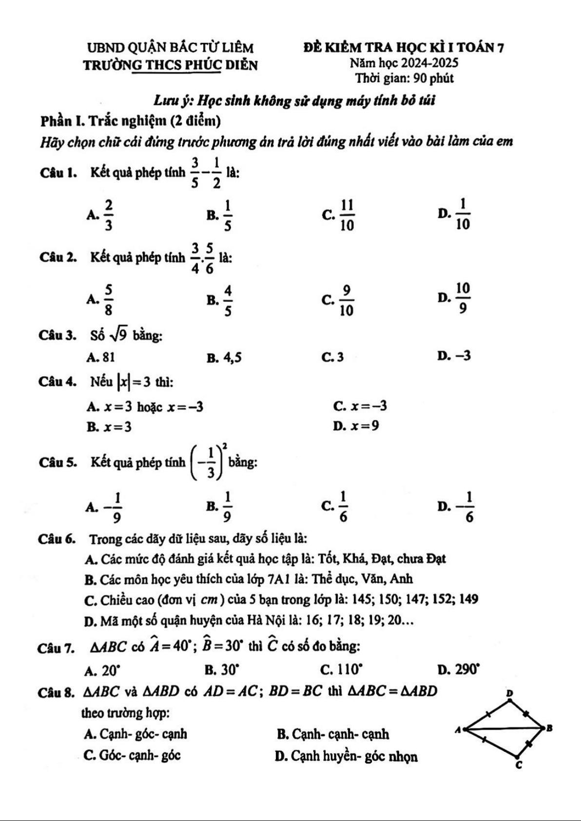 Đề học kì 1 Toán 7 năm 2024 – 2025 trường THCS Phúc Diễn – Hà Nội