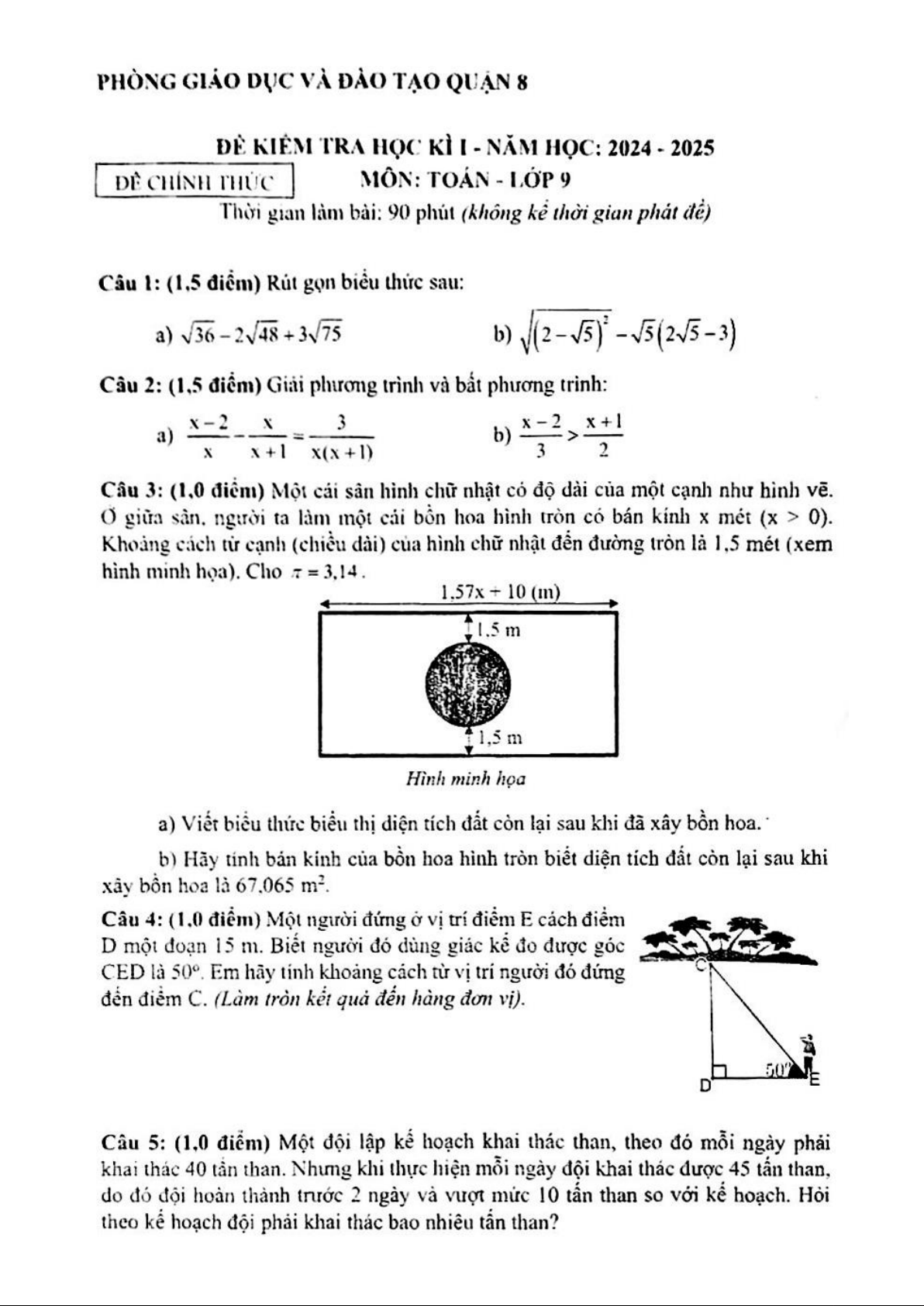 Đề học kì 1 Toán 9 năm 2024 – 2025 phòng GD&ĐT Quận 8 – TP HCM