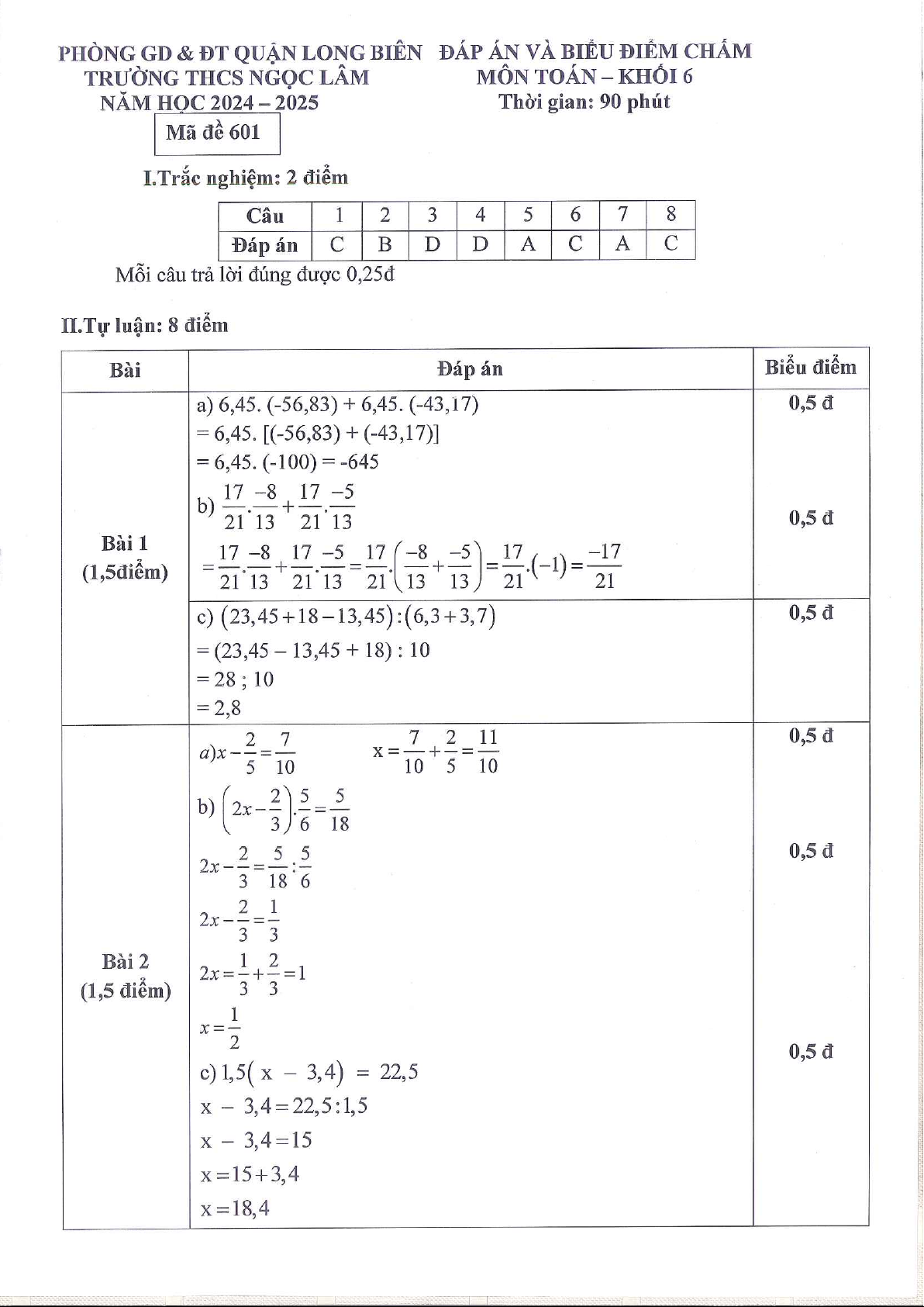 Giới thiệu đến quý thầy, cô giáo và các em học sinh lớp 6 đề kiểm tra cuối học kì 2 môn Toán 6 năm học 2024 – 2025 trường THCS Ngọc Lâm, quận Long Biên, thành phố Hà Nội. Kỳ thi được diễn ra vào ngày 25 tháng 04 năm 2025. Đề thi có đáp án, lời giải chi tiết và hướng dẫn chấm điểm.