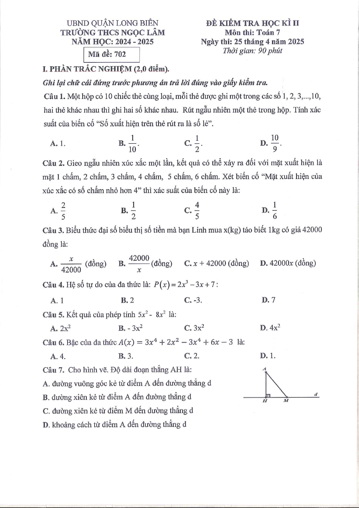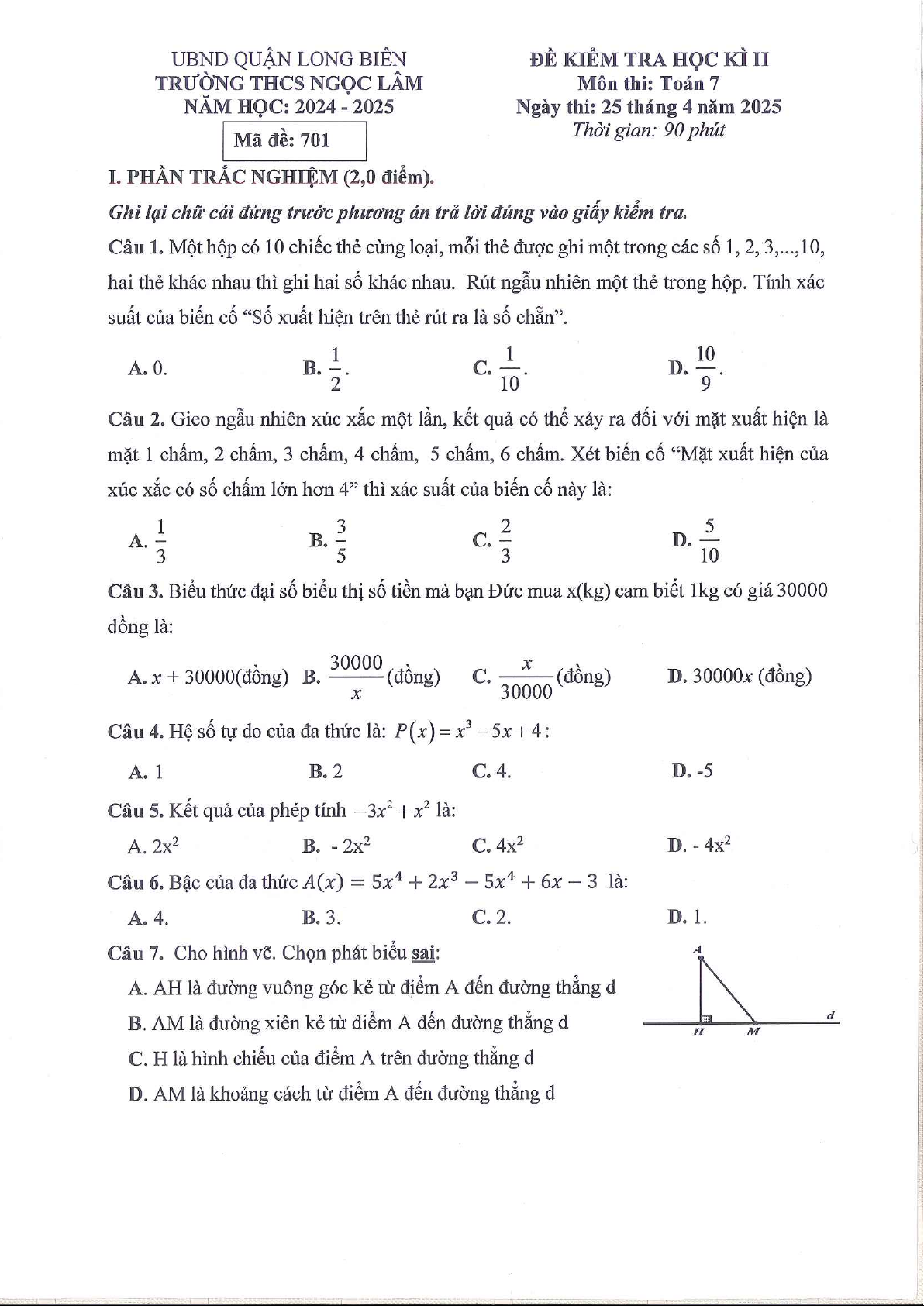 Đề học kì 2 Toán 7 năm 2024 – 2025 trường THCS Ngọc Lâm – Hà Nội